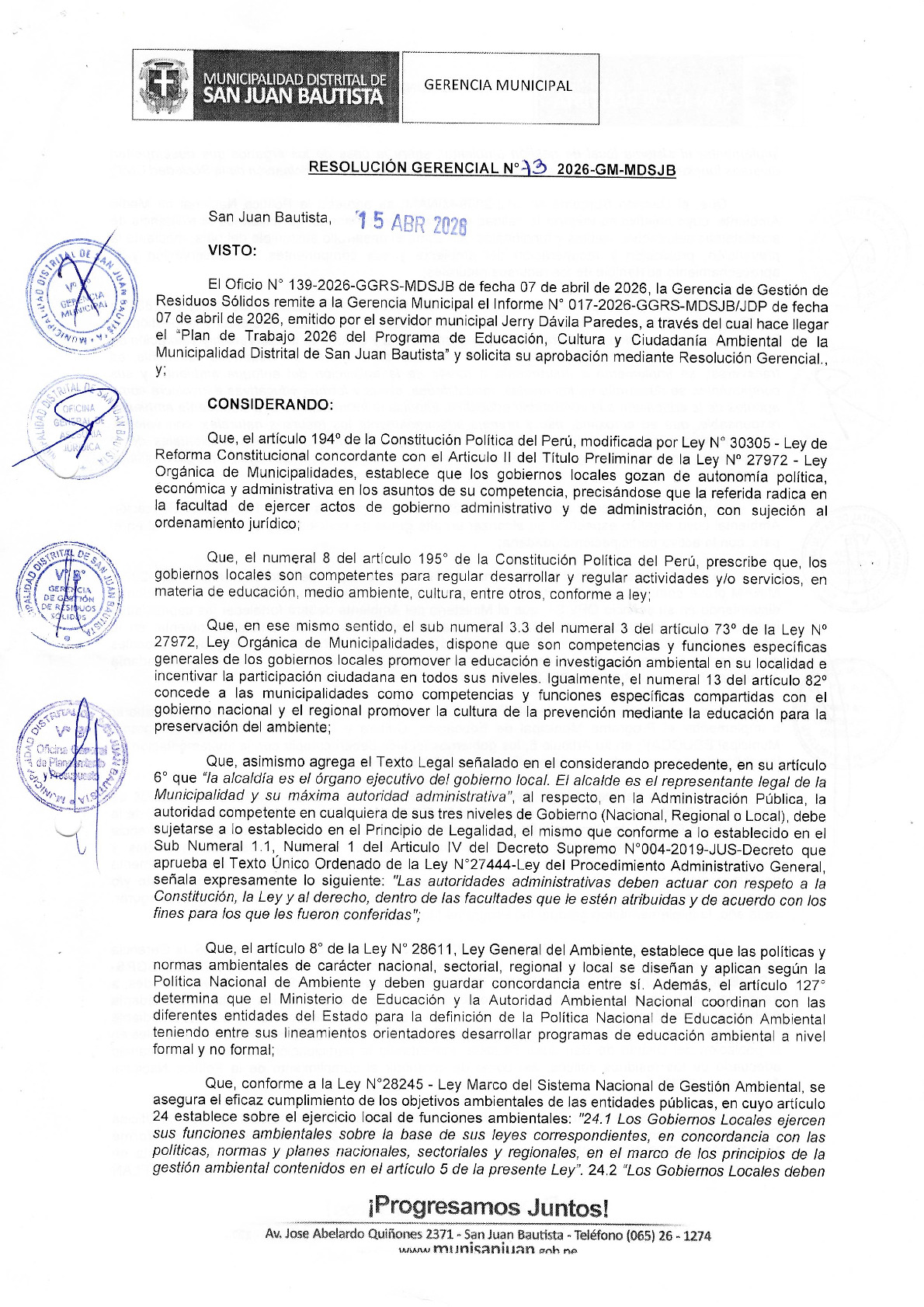 La presente Resolución de Gerencia Municipal aprueba el Plan de Trabajo 2026 del Programa Municipal de Educación, Cultura y Ciudadanía Ambiental de la Municipalidad Distrital de San Juan Bautista (Maynas - Loreto), con la finalidad de definir las actividades de educación, cultura y ciudadanía ambiental que se desarrollarán en la localidad durante el presente año.