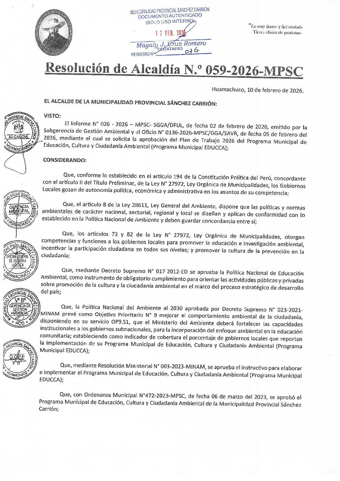 La presente Resolución de Alcaldía aprueba el Plan de Trabajo 2026 del Programa Municipal de Educación, Cultura y Ciudadanía Ambiental de la Municipalidad Provincial de Sanchez Carrión (La Libertad), con la finalidad de definir las actividades de educación, cultura y ciudadanía ambiental que se desarrollarán en la localidad durante el presente año.