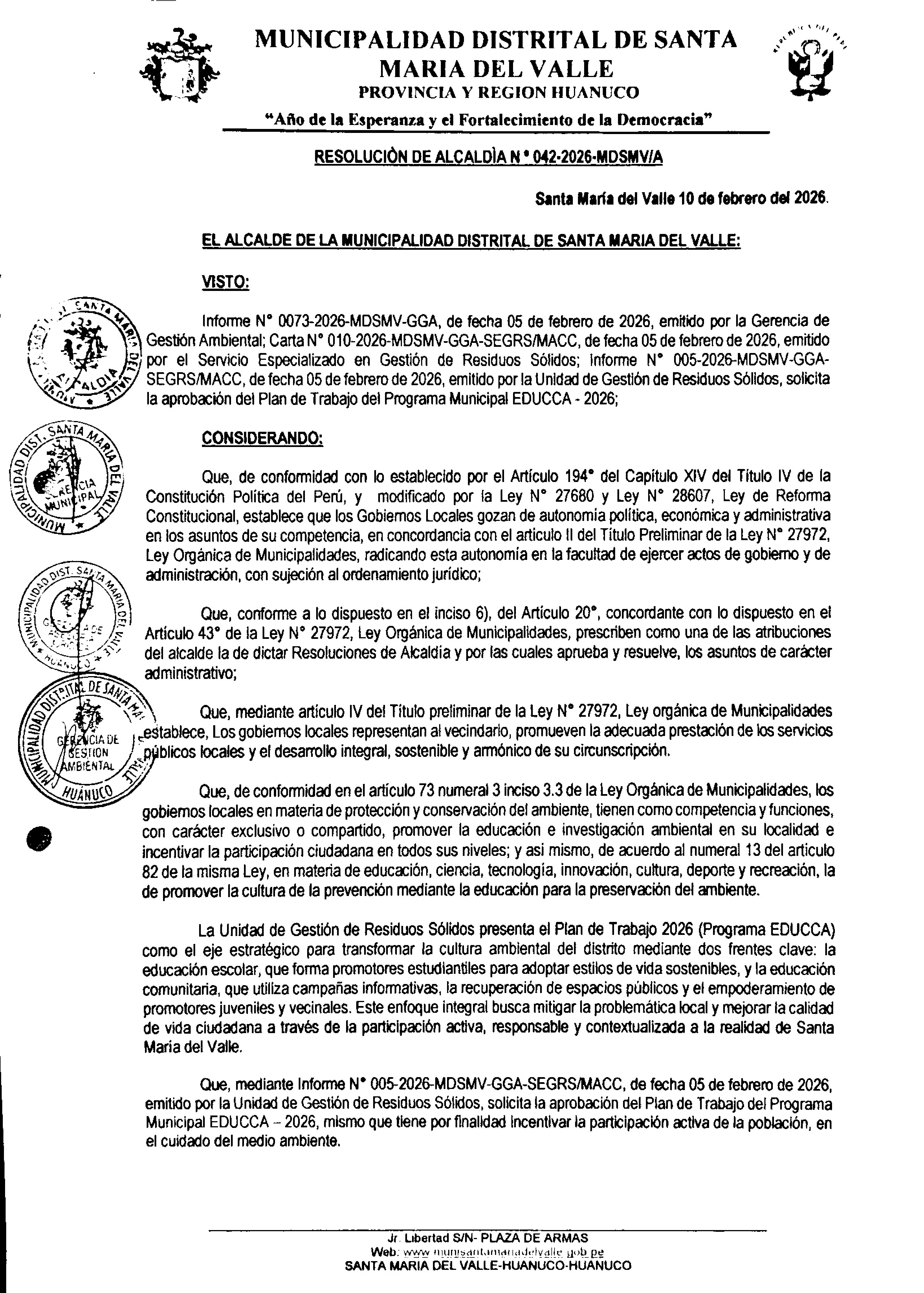 La presente Resolución de Alcaldía aprueba el Plan de Trabajo 2026 del Programa Municipal de Educación, Cultura y Ciudadanía Ambiental de la Municipalidad Distrital de Santa María del Valle (Huánuco - Huánuco), con la finalidad de definir las actividades de educación, cultura y ciudadanía ambiental que se desarrollarán en la localidad durante el presente año.