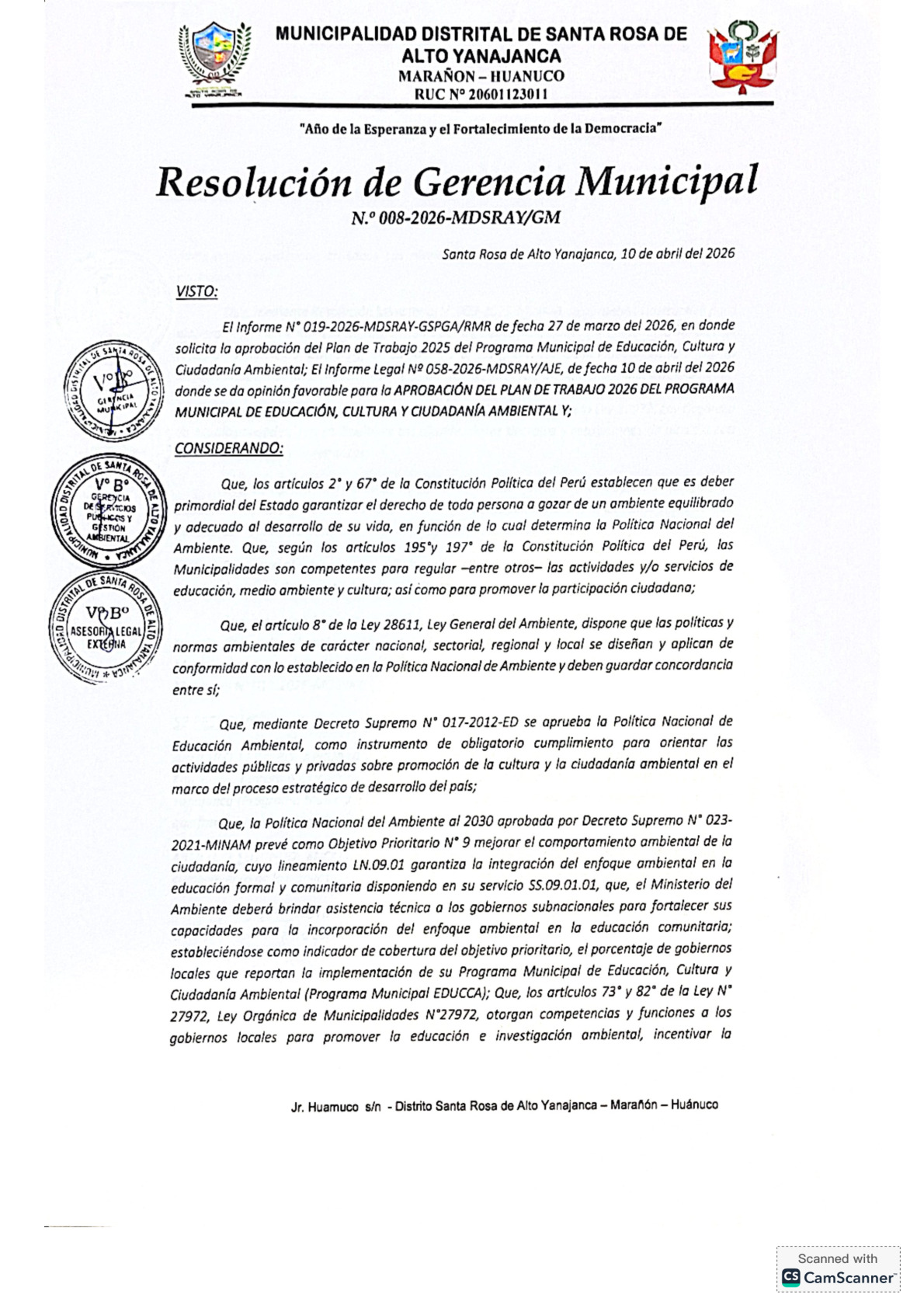 La presente Resolución de Gerencia Municipal aprueba el Plan de Trabajo 2026 del Programa Municipal de Educación, Cultura y Ciudadanía Ambiental de la Municipalidad Distrital de Santa Rosa de Alto Yanajanca (Marañon - Huánuco), con la finalidad de definir las actividades de educación, cultura y ciudadanía ambiental que se desarrollarán en la localidad durante el presente año.