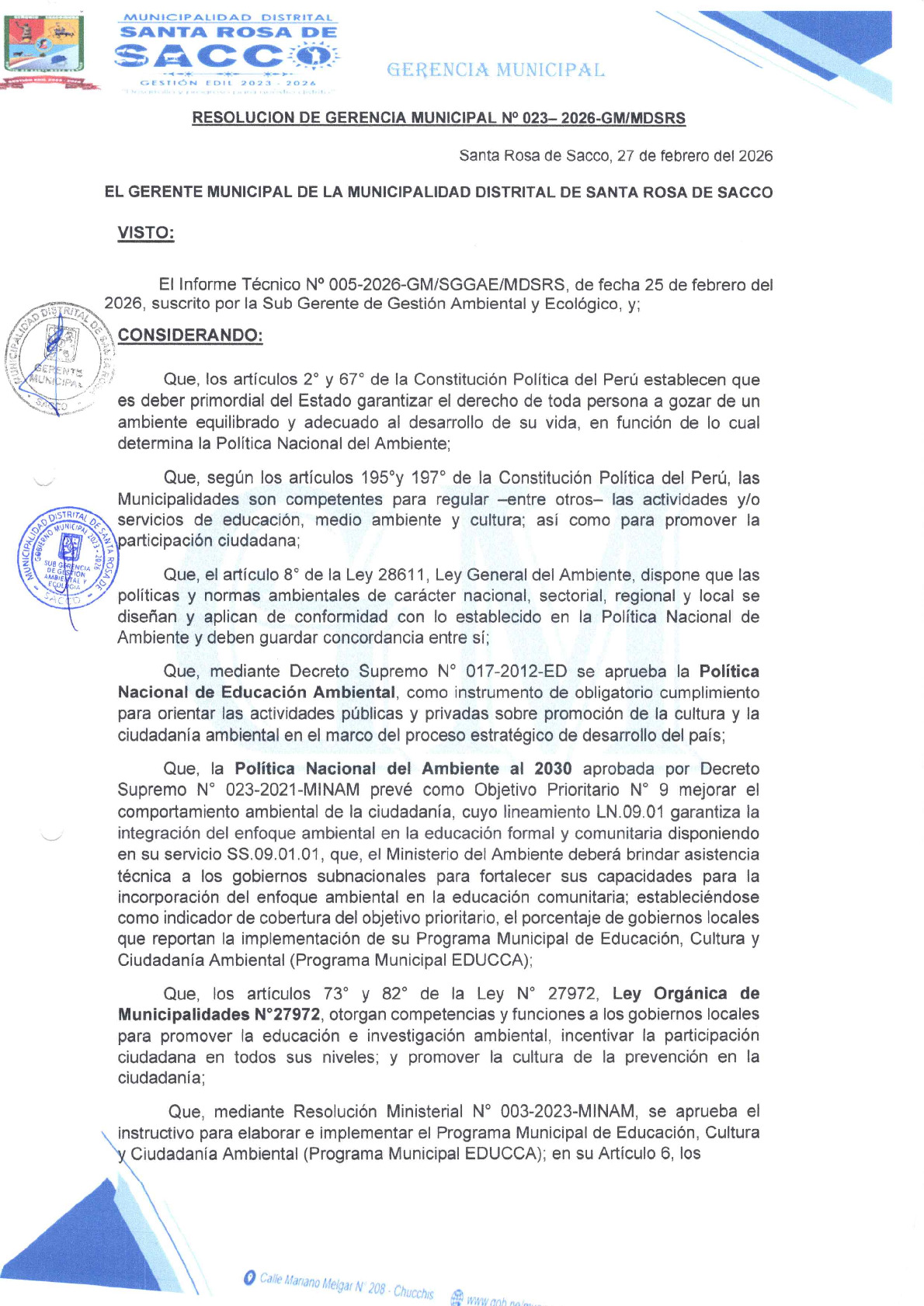 La presente Resolución de Gerencia Municipal aprueba el Plan de Trabajo 2026 del Programa Municipal de Educación, Cultura y Ciudadanía Ambiental de la Municipalidad Distrital de Santa Rosa de Sacco - Yauli (Junín), con la finalidad de definir las actividades de educación, cultura y ciudadanía ambiental que se desarrollarán en la localidad durante el presente año.