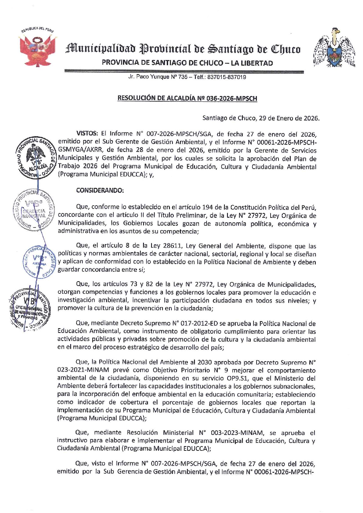 La presente Resolución de Alcaldía aprueba el Plan de Trabajo 2026 del Programa Municipal de Educación, Cultura y Ciudadanía Ambiental de la Municipalidad Provincial de Santiago de Chuco (La Libertad), con la finalidad de definir las actividades de educación, cultura y ciudadanía ambiental que se desarrollarán en la localidad durante el presente año.