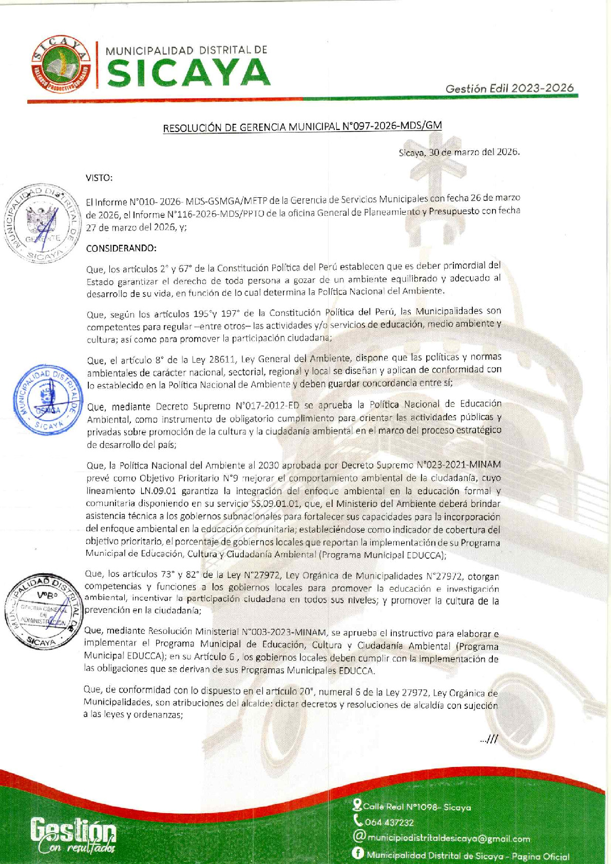 La presente Resolución de Gerencia Municipal aprueba el Plan de Trabajo 2026 del Programa Municipal de Educación, Cultura y Ciudadanía Ambiental de la Municipalidad Distrital de Sicaya - Huancayo (Junín), con la finalidad de definir las actividades de educación, cultura y ciudadanía ambiental que se desarrollarán en la localidad durante el presente año.