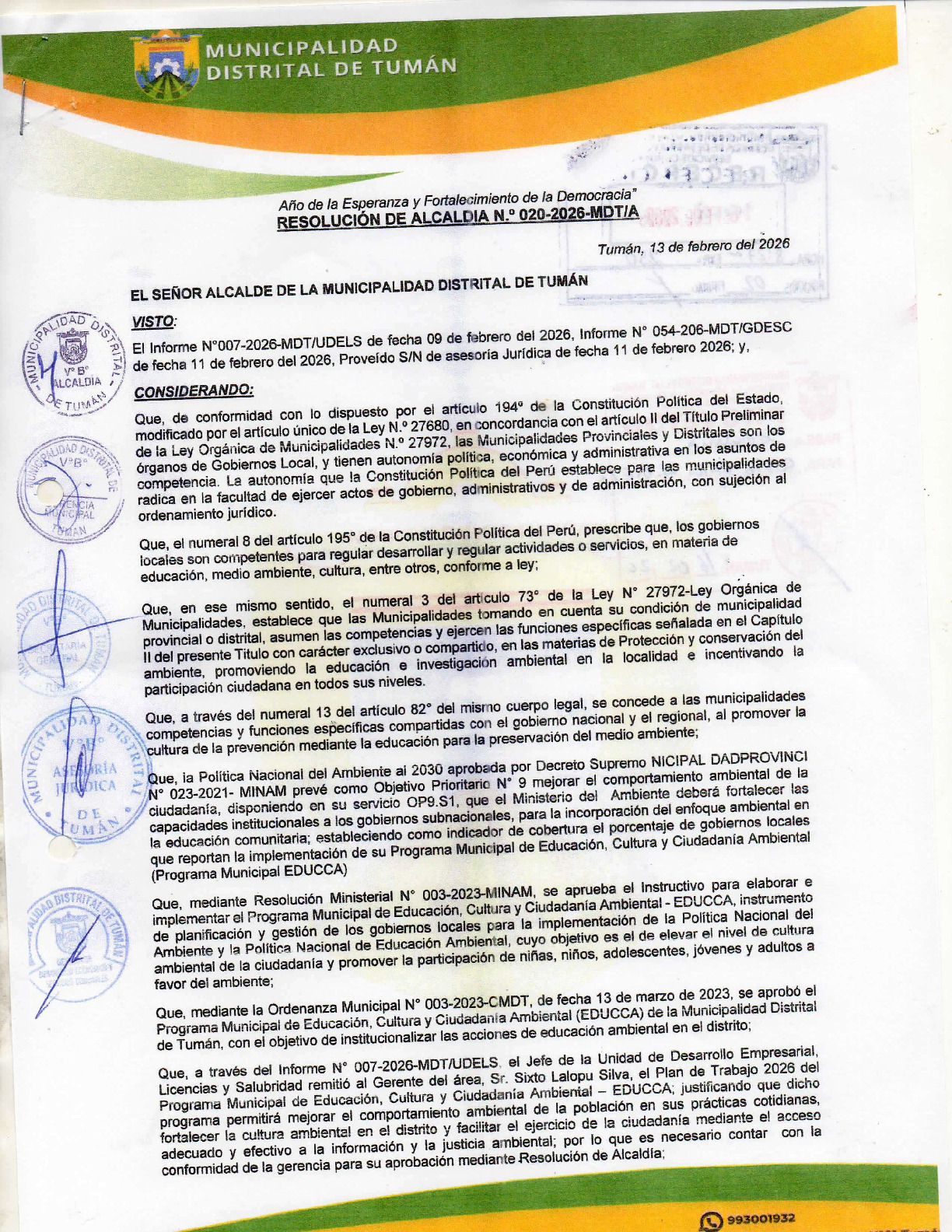 La presente Resolución de Alcaldía aprueba el Plan de Trabajo 2026 del Programa Municipal de Educación, Cultura y Ciudadanía Ambiental de la Municipalidad Distrital de Tumán (Chiclayo - Lambayeque), con la finalidad de definir las actividades de educación, cultura y ciudadanía ambiental que se desarrollarán en la localidad durante el presente año.