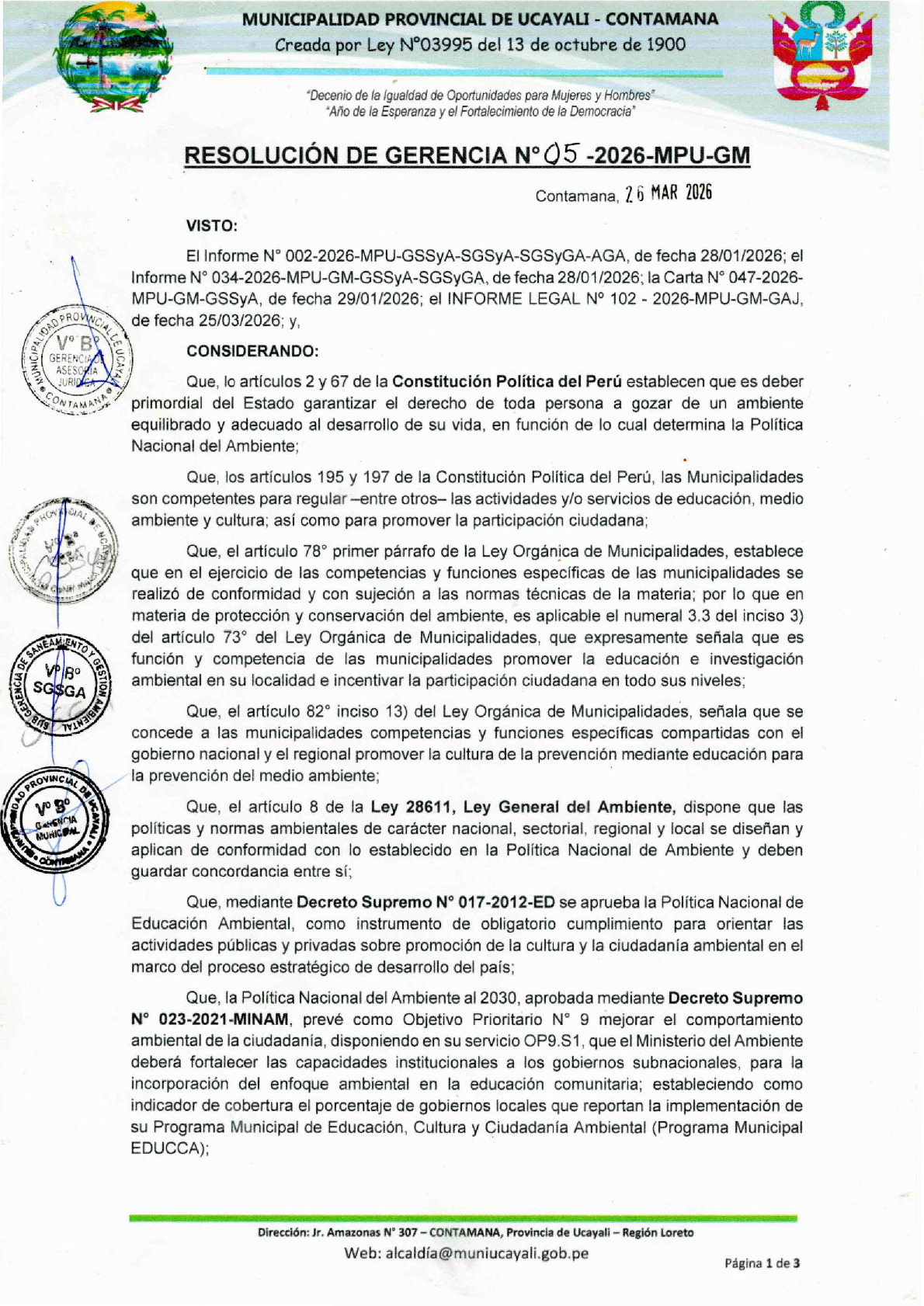La presente Resolución de Gerencia Municipal aprueba el Plan de Trabajo 2026 del Programa Municipal de Educación, Cultura y Ciudadanía Ambiental de la Municipalidad Provincial de Ucayali (Loreto), con la finalidad de definir las actividades de educación, cultura y ciudadanía ambiental que se desarrollarán en la localidad durante el presente año.