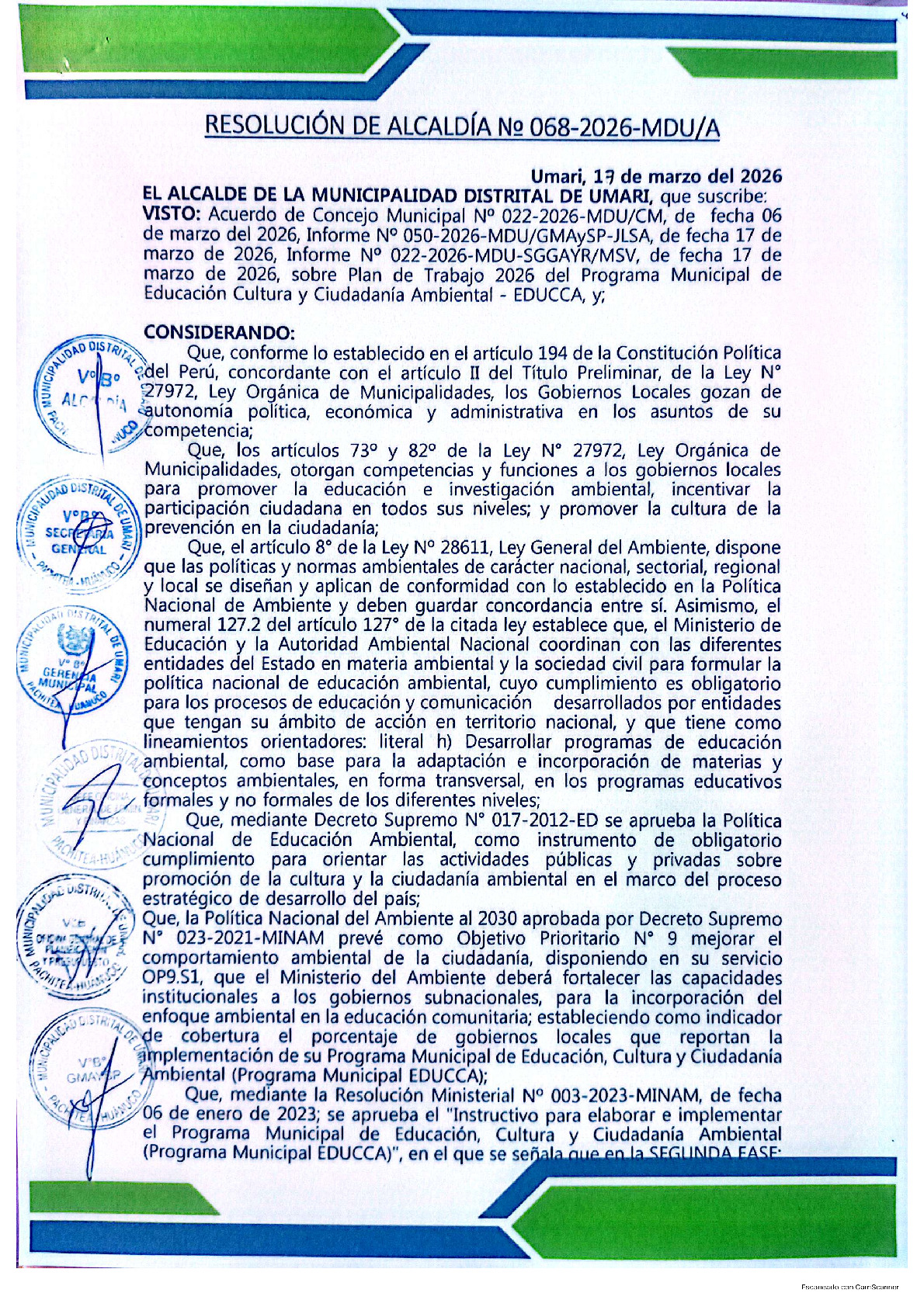 La presente Resolución de Alcaldia aprueba el Plan de Trabajo 2026 del Programa Municipal de Educación, Cultura y Ciudadanía Ambiental de la Municipalidad Distrital de Umari (Pachitea - Huánuco), con la finalidad de definir las actividades de educación, cultura y ciudadanía ambiental que se desarrollarán en la localidad durante el presente año.