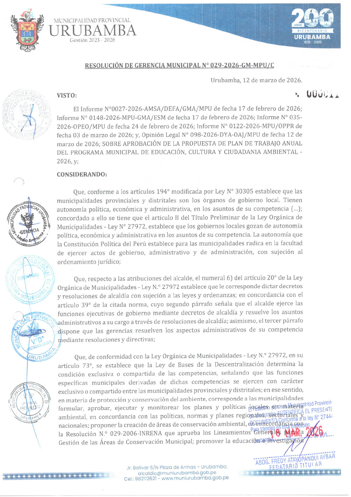 La presente Resolución de Gerencia Municipal aprueba el Plan de Trabajo 2026 del Programa Municipal de Educación, Cultura y Ciudadanía Ambiental de la Municipalidad Provincial de Urubamba - Urubamba (Cusco), con la finalidad de definir las actividades de educación, cultura y ciudadanía ambiental que se desarrollarán en la localidad durante el presente año.