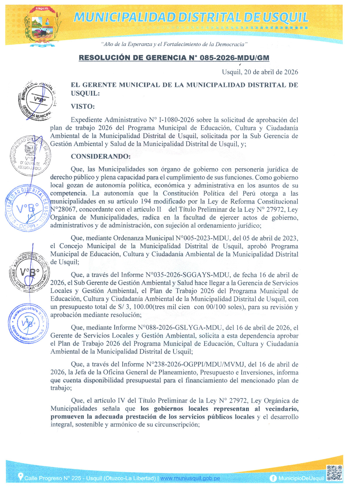 La presente Resolución de Gerencia Municipal aprueba el Plan de Trabajo 2026 del Programa Municipal de Educación, Cultura y Ciudadanía Ambiental de la Municipalidad Distrital de Usquil (Otuzco - La Libertad), con la finalidad de definir las actividades de educación, cultura y ciudadanía ambiental que se desarrollarán en la localidad durante el presente año.