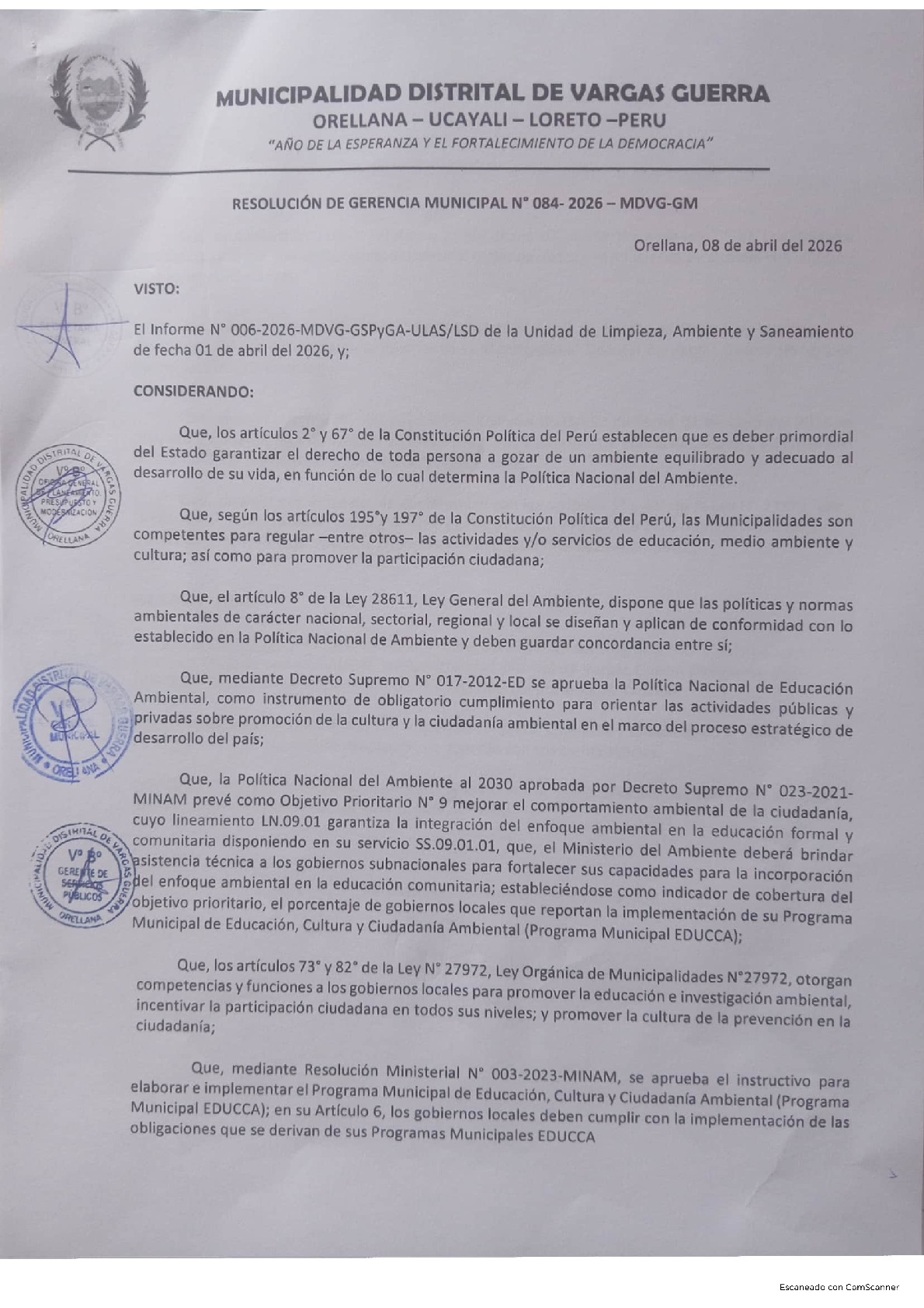 La presente Resolución de Gerencia Municipal aprueba el Plan de Trabajo 2026 del Programa Municipal de Educación, Cultura y Ciudadanía Ambiental de la Municipalidad Distrital de Vargas Guerra (Ucayali Loreto), con la finalidad de definir las actividades de educación, cultura y ciudadanía ambiental que se desarrollarán en la localidad durante el presente año.