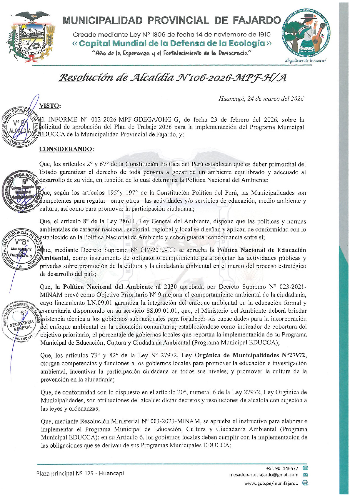 La presente Resolución de Alcaldía aprueba el Plan de Trabajo 2026 del Programa Municipal de Educación, Cultura y Ciudadanía Ambiental de la Municipalidad Provincial de Víctor Fajardo/ Víctor Fajardo (Ayacucho), con la finalidad de definir las actividades de educación, cultura y ciudadanía ambiental que se desarrollarán en la localidad durante el presente año.