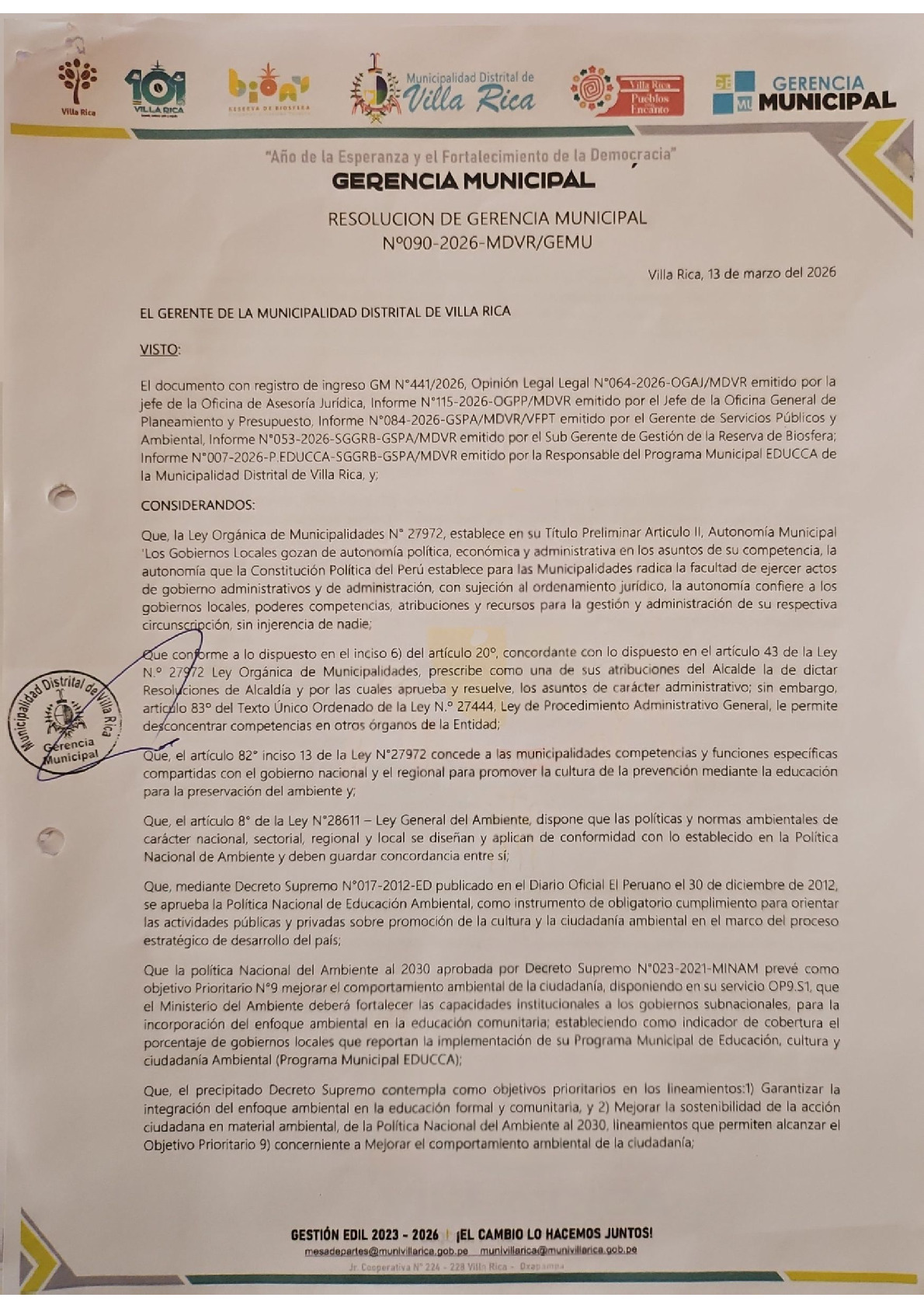 La presente Resolución de Gerencia Municipal aprueba el Plan de Trabajo 2026 del Programa Municipal de Educación, Cultura y Ciudadanía Ambiental de la Municipalidad Distrital de Villa Rica - Oxapampa (Pasco), con la finalidad de definir las actividades de educación, cultura y ciudadanía ambiental que se desarrollarán en la localidad durante el presente año.