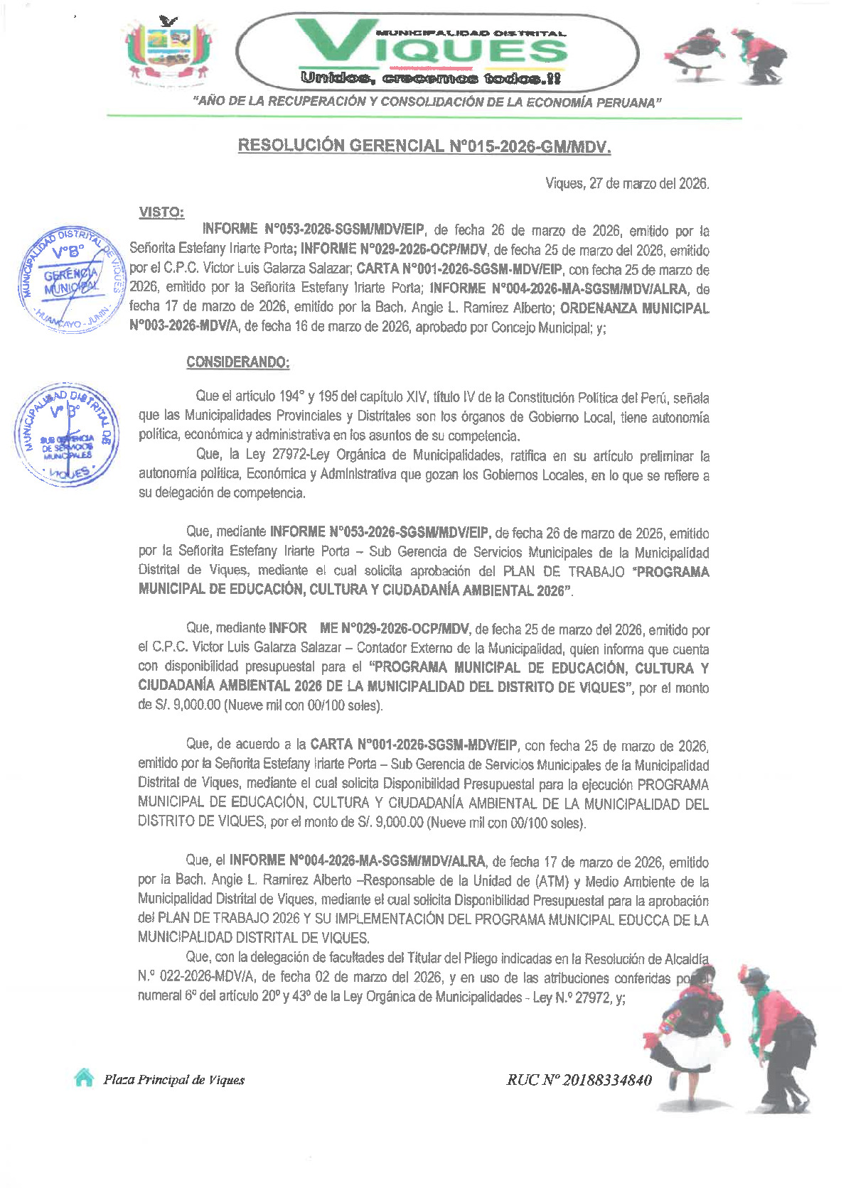 La presente Resolución de Gerencia Municipal aprueba el Plan de Trabajo 2026 del Programa Municipal de Educación, Cultura y Ciudadanía Ambiental de la Municipalidad Distrital de Viques - Huancayo (Junín), con la finalidad de definir las actividades de educación, cultura y ciudadanía ambiental que se desarrollarán en la localidad durante el presente año.