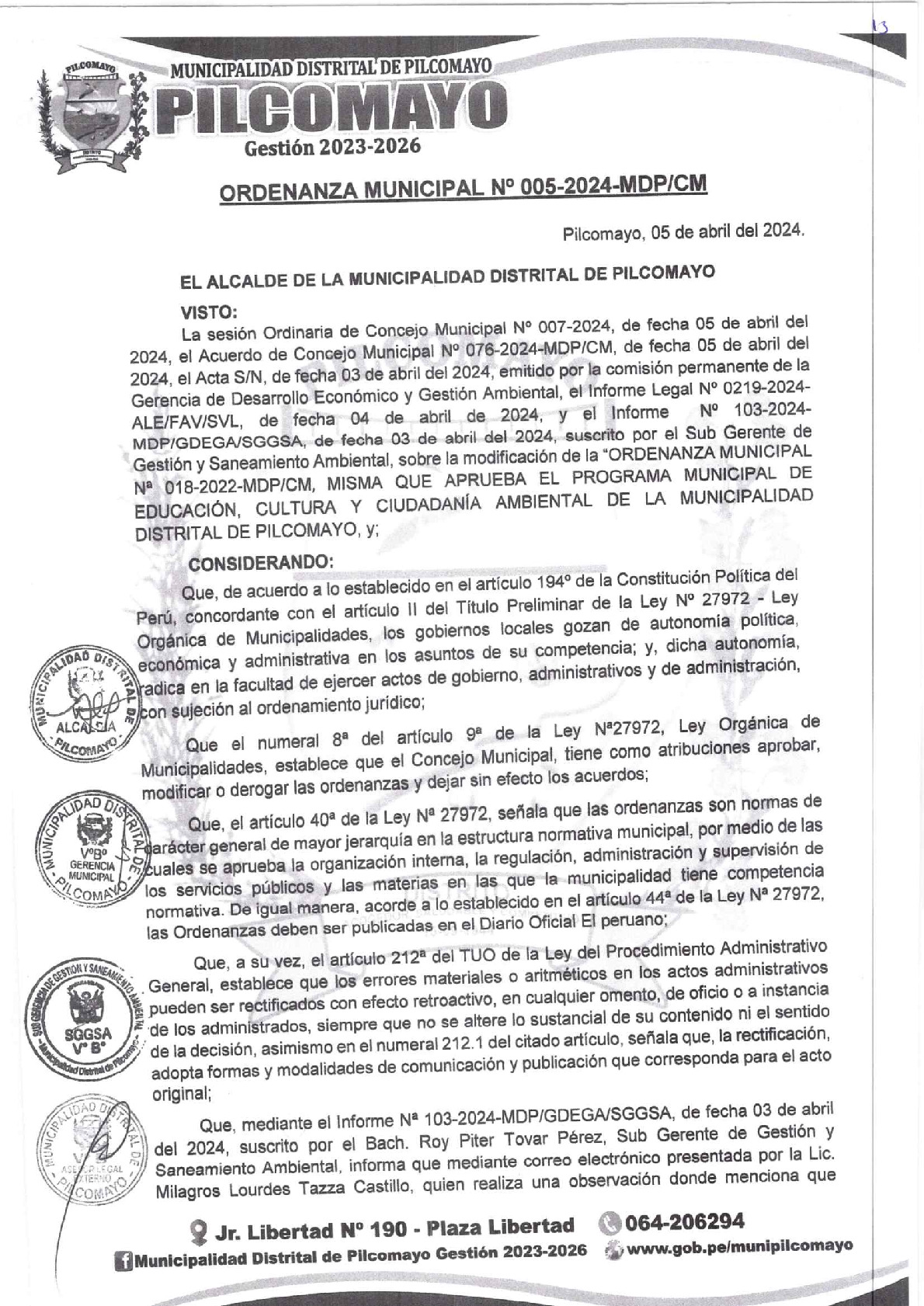 La presente Ordenanza aprueba el Programa Municipal de Educación, Cultura y Ciudadanía Ambiental de la Municipalidad Distrital de Pilcomayo - Huancayo (Junín), con la finalidad de promover la cultura y la educación ambiental para la formación de ciudadanas y ciudadanos ambientalmente responsables e incentivar la participación ciudadana en todos sus niveles.