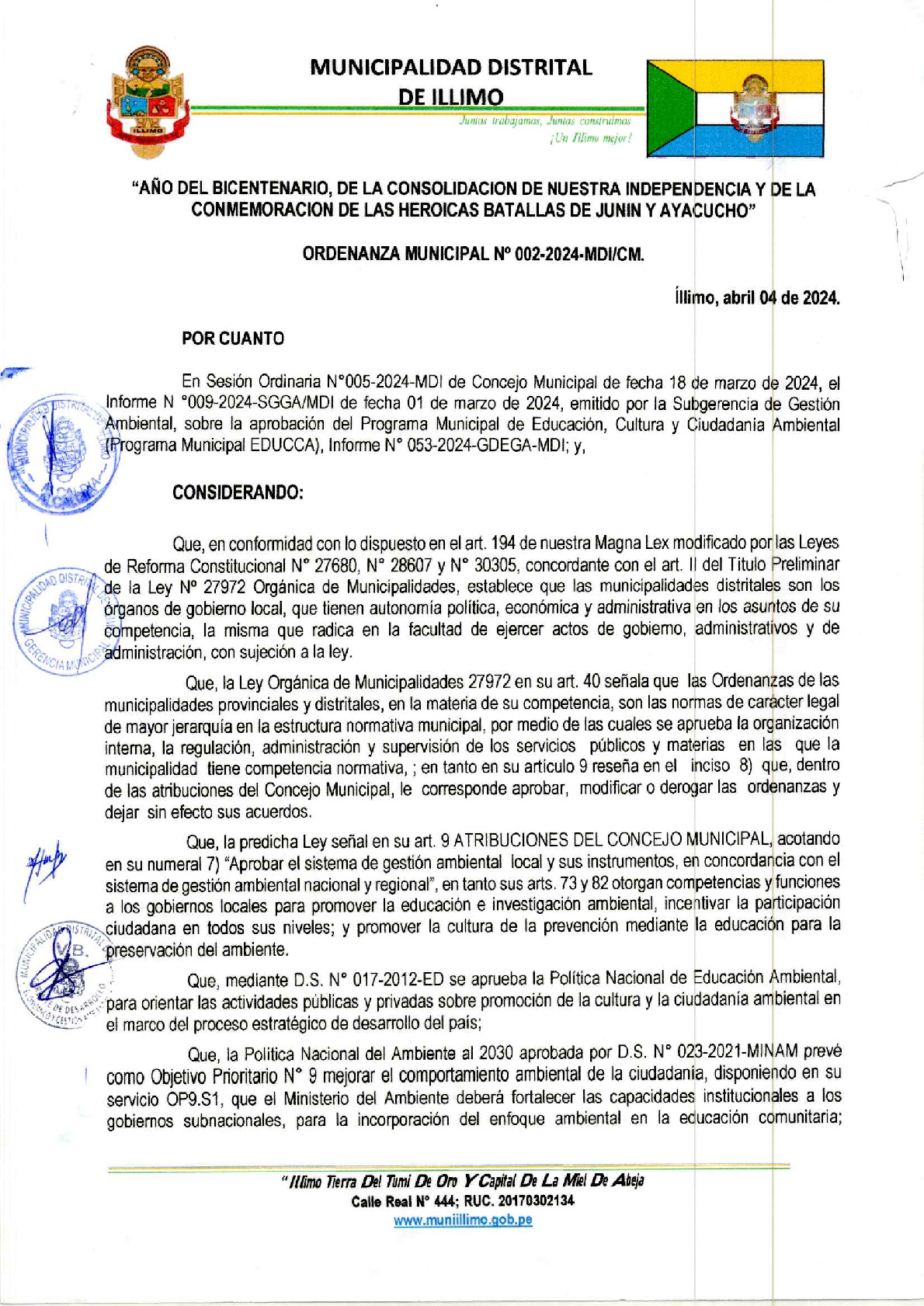 La presente Ordenanza aprueba el Programa Municipal de Educación, Cultura y Ciudadanía Ambiental de la Municipalidad Distrital de Illimo - Lambayeque (Lambayeque), con la finalidad de promover la cultura y la educación ambiental para la formación de ciudadanas y ciudadanos ambientalmente responsables e incentivar la participación ciudadana en todos sus niveles.