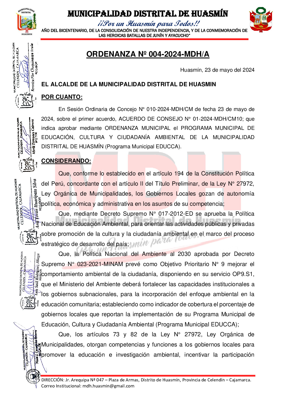 La presente Ordenanza aprueba el Programa Municipal de Educación, Cultura y Ciudadanía Ambiental de la Municipalidad Distrital de Huasmín - Celendín (Cajamarca), con la finalidad de promover la cultura y la educación ambiental para la formación de ciudadanas y ciudadanos ambientalmente responsables e incentivar la participación ciudadana en todos sus niveles.