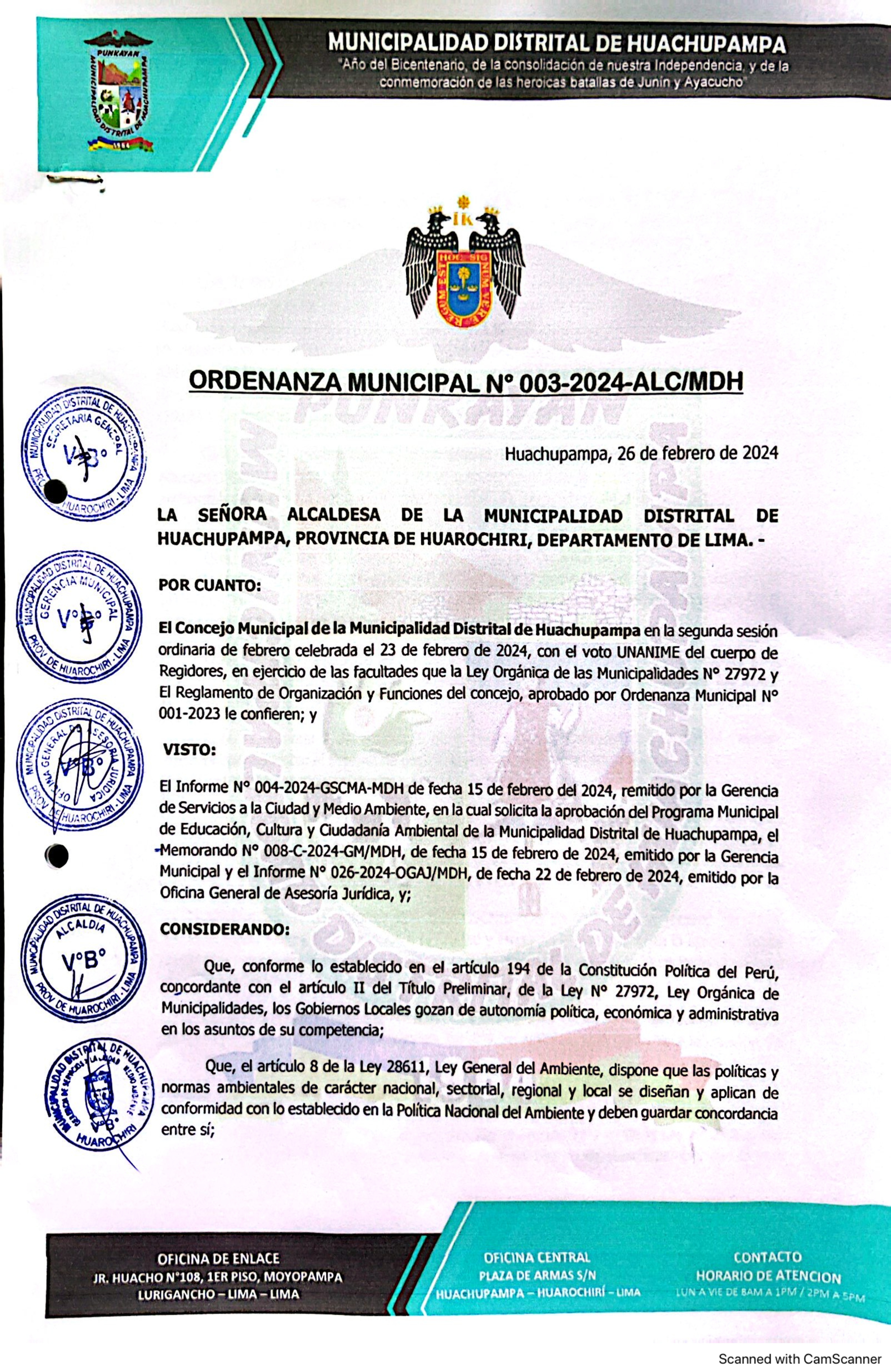 La presente Ordenanza aprueba el Programa Municipal de Educación, Cultura y Ciudadanía Ambiental de la Municipalidad Distrital de Huachupampa - Huarochirí (Lima), con la finalidad de promover la cultura y la educación ambiental para la formación de ciudadanas y ciudadanos ambientalmente responsables e incentivar la participación ciudadana en todos sus niveles.