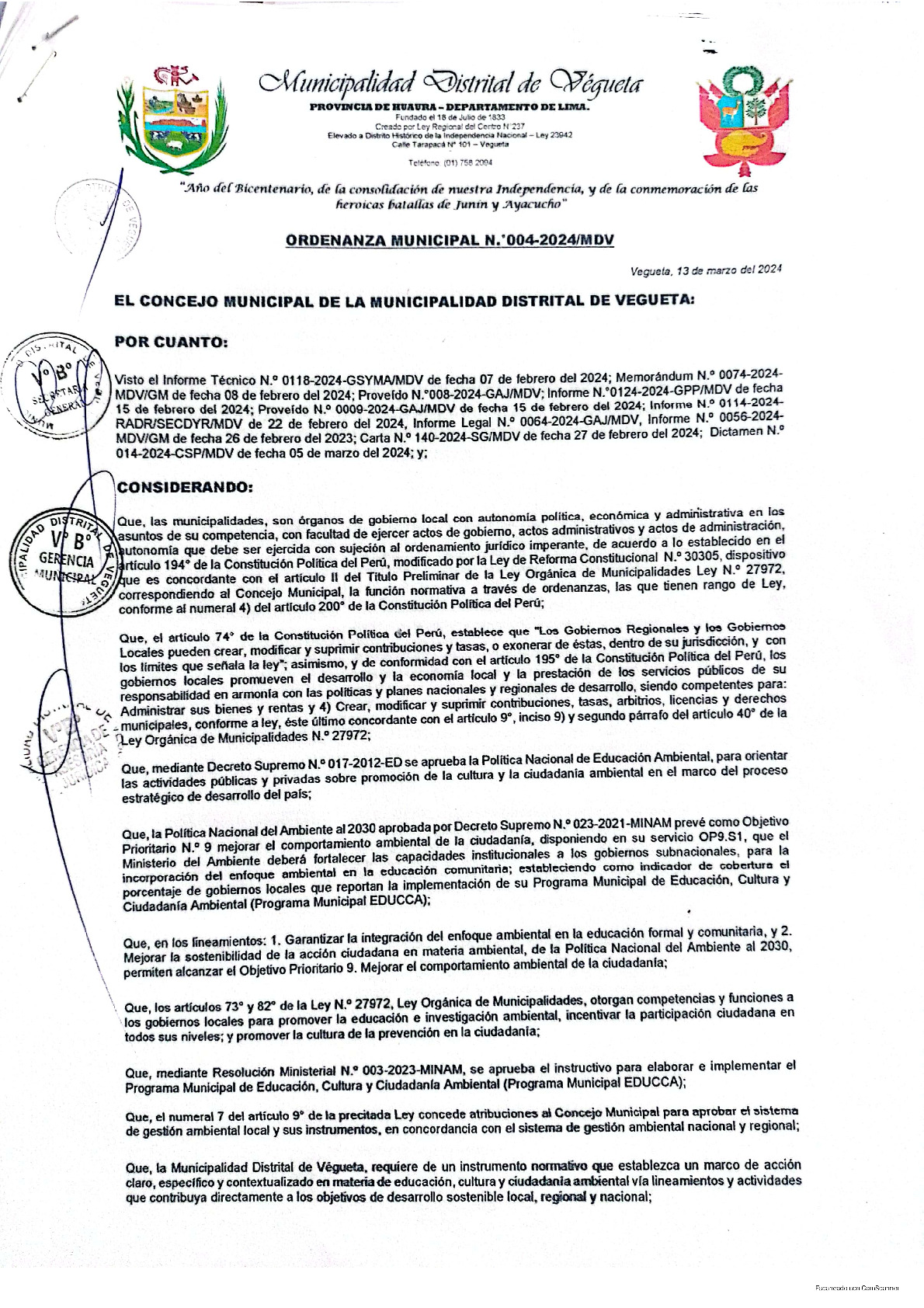 La presente Ordenanza aprueba el Programa Municipal de Educación, Cultura y Ciudadanía Ambiental de la Municipalidad Distrital de Végueta - Huaura (Lima), con la finalidad de promover la cultura y la educación ambiental para la formación de ciudadanas y ciudadanos ambientalmente responsables e incentivar la participación ciudadana en todos sus niveles.