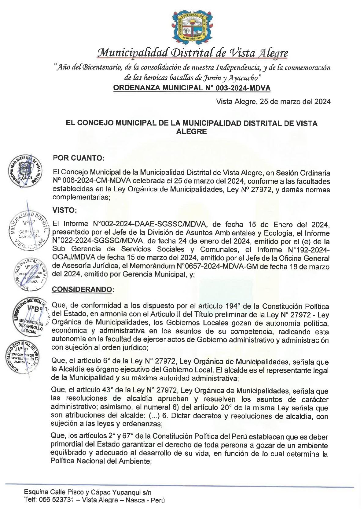 La presente Ordenanza aprueba el Programa Municipal de Educación, Cultura y Ciudadanía Ambiental de la Municipalidad Distrital de Vista Alegre - Nazca (Ica), con la finalidad de promover la cultura y la educación ambiental para la formación de ciudadanas y ciudadanos ambientalmente responsables e incentivar la participación ciudadana en todos sus niveles.