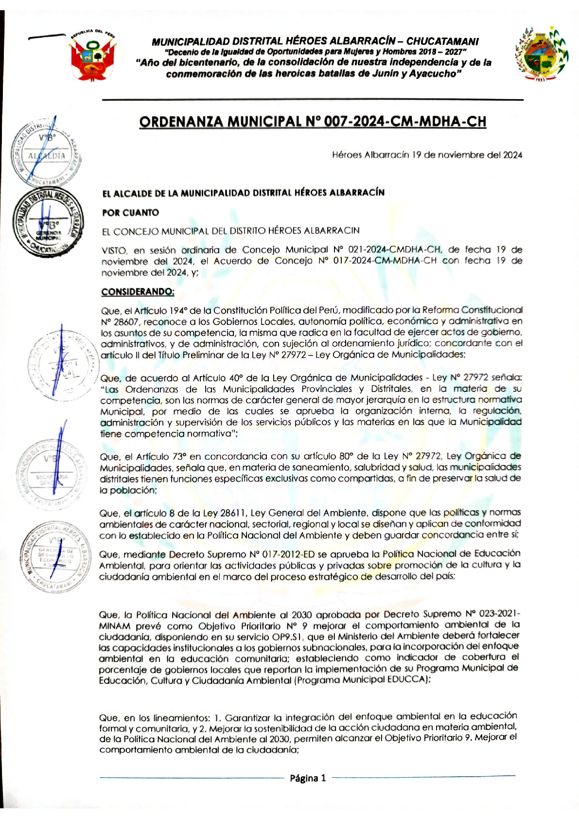 La presente Ordenanza aprueba el Programa Municipal de Educación, Cultura y Ciudadanía Ambiental de la Municipalidad Distrital de Héroes Albarracín - Tarata (Tacna), con la finalidad de promover la cultura y la educación ambiental para la formación de ciudadanas y ciudadanos ambientalmente responsables e incentivar la participación ciudadana en todos sus niveles.
