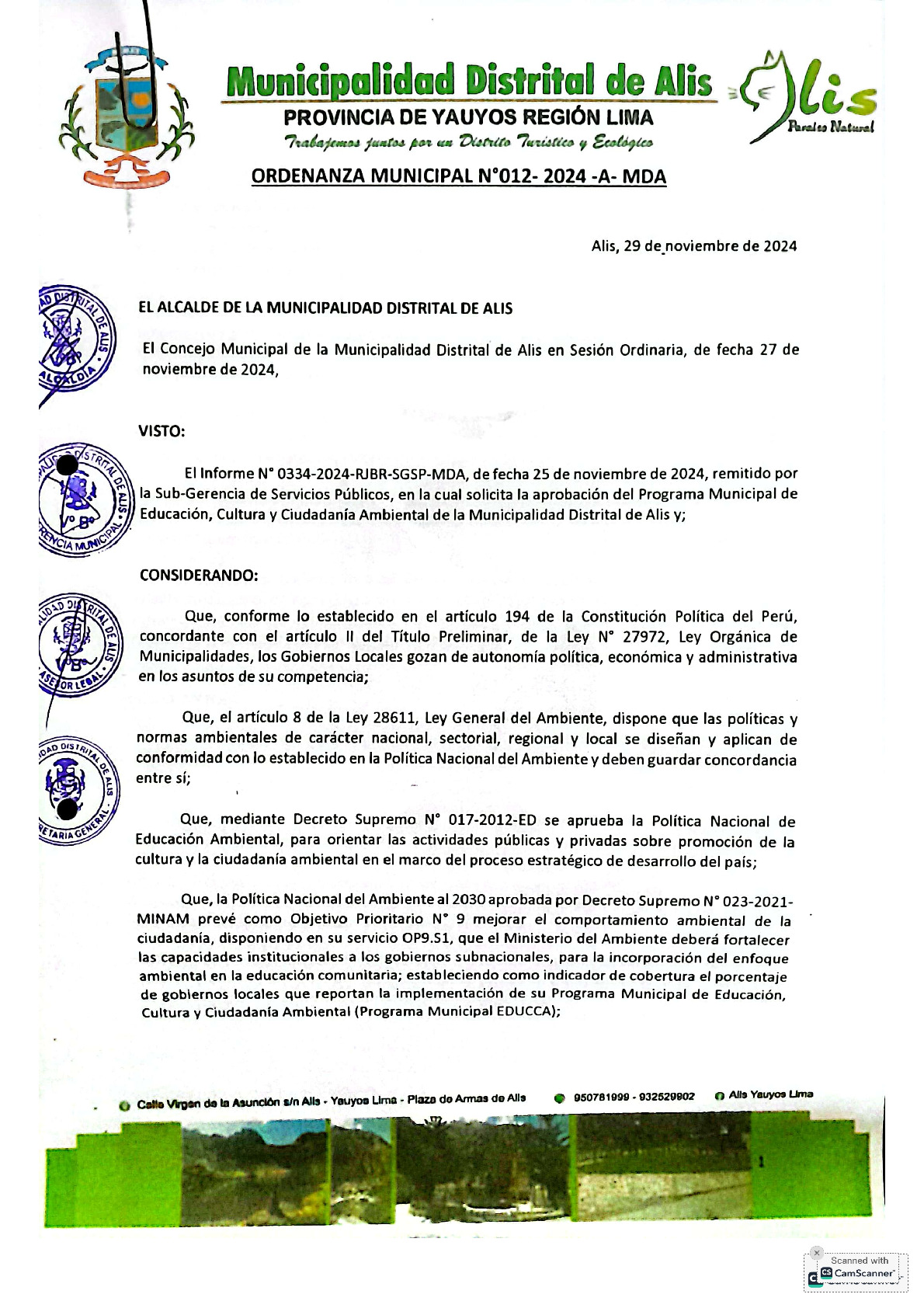 La presente Ordenanza aprueba el Programa Municipal de Educación, Cultura y Ciudadanía Ambiental de la Municipalidad Distrital de Alis - Yauyos (Lima), con la finalidad de promover la cultura y la educación ambiental para la formación de ciudadanas y ciudadanos ambientalmente responsables e incentivar la participación ciudadana en todos sus niveles.