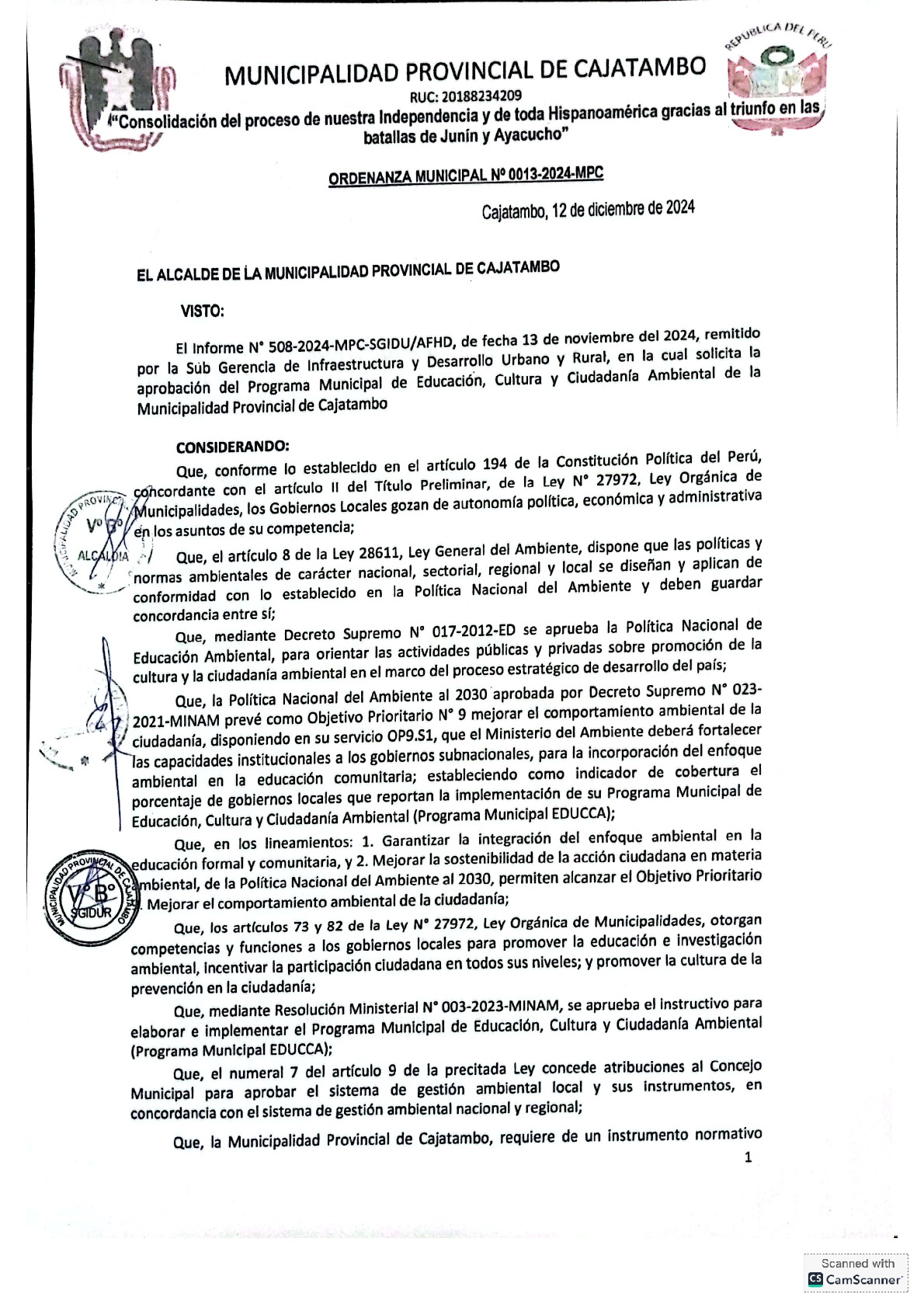 La presente Ordenanza aprueba el Programa Municipal de Educación, Cultura y Ciudadanía Ambiental de la Municipalidad Distrital de Cajatambo - Lima (Lima), con la finalidad de promover la cultura y la educación ambiental para la formación de ciudadanas y ciudadanos ambientalmente responsables e incentivar la participación ciudadana en todos sus niveles.