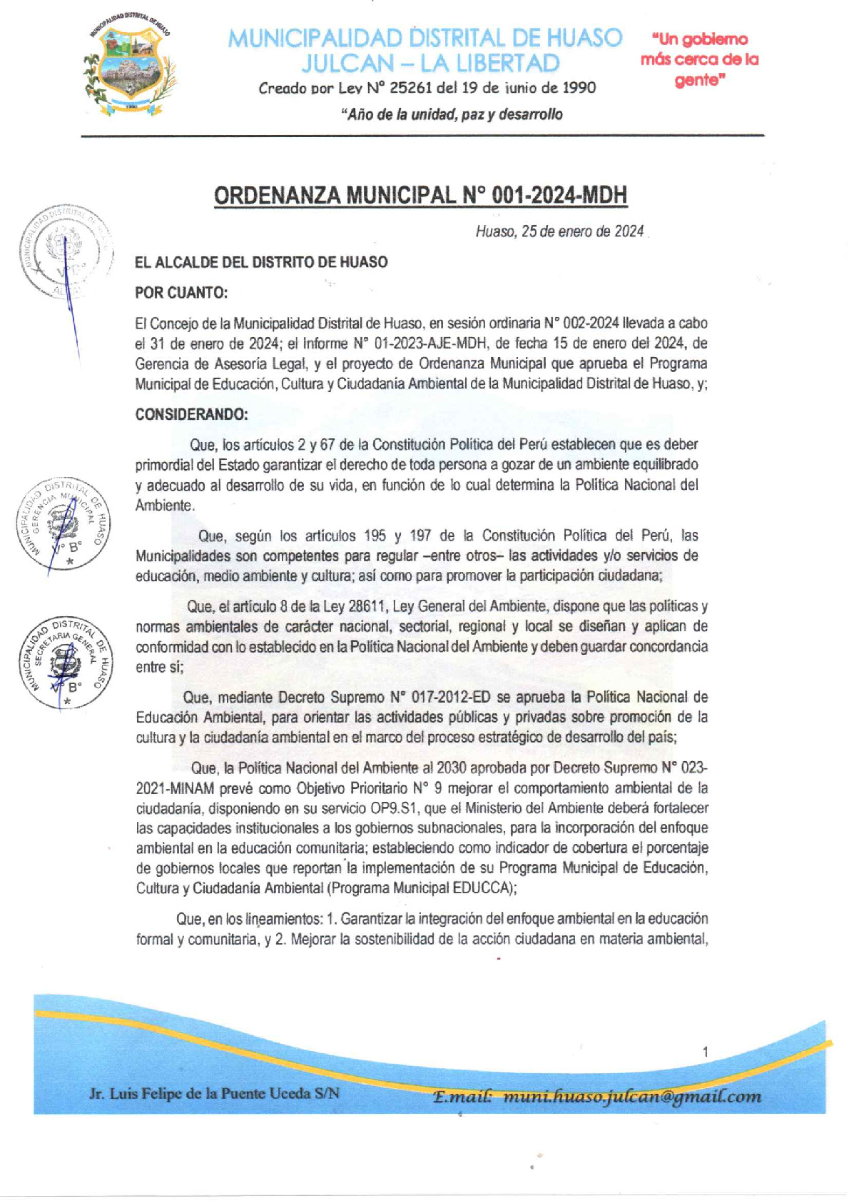 La presente Ordenanza aprueba el Programa Municipal de Educación, Cultura y Ciudadanía Ambiental de la Municipalidad Distrital de Huaso - Julcan (La Libertad), con la finalidad de promover la cultura y la educación ambiental para la formación de ciudadanas y ciudadanos ambientalmente responsables e incentivar la participación ciudadana en todos sus niveles.