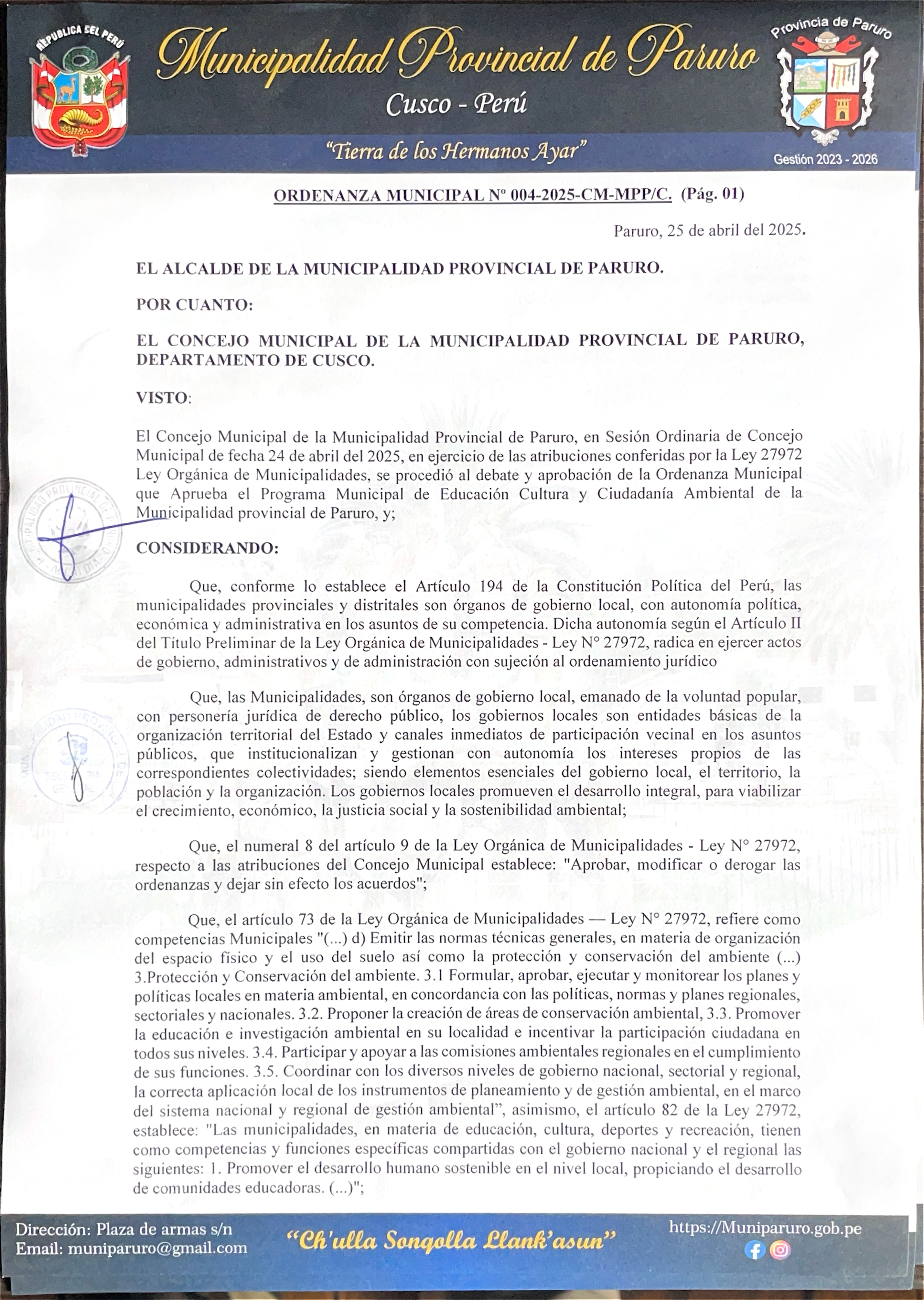 La presente Ordenanza aprueba el Programa Municipal de Educación, Cultura y Ciudadanía Ambiental de la Municipalidad Provincial de Paruro - Paruro (Cusco)), con la finalidad de promover la cultura y la educación ambiental para la formación de ciudadanas y ciudadanos ambientalmente responsables e incentivar la participación ciudadana en todos sus niveles.