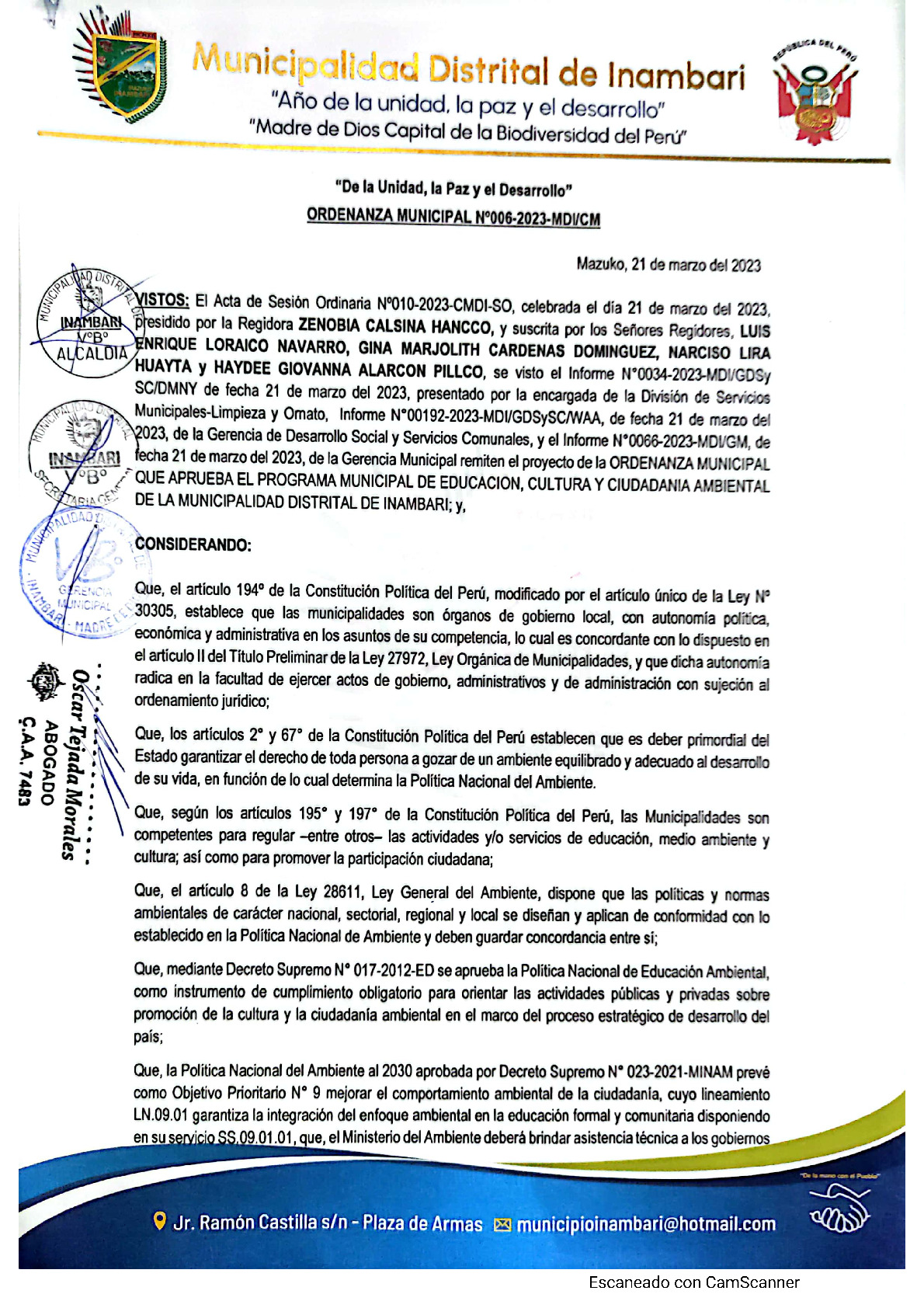 La presente Ordenanza aprueba el Programa Municipal de Educación, Cultura y Ciudadanía Ambiental de la Municipalidad Distrital de Inambari - Tambopata (Madre de Dios), con la finalidad de promover la cultura y la educación ambiental para la formación de ciudadanas y ciudadanos ambientalmente responsables e incentivar la participación ciudadana en todos sus niveles.