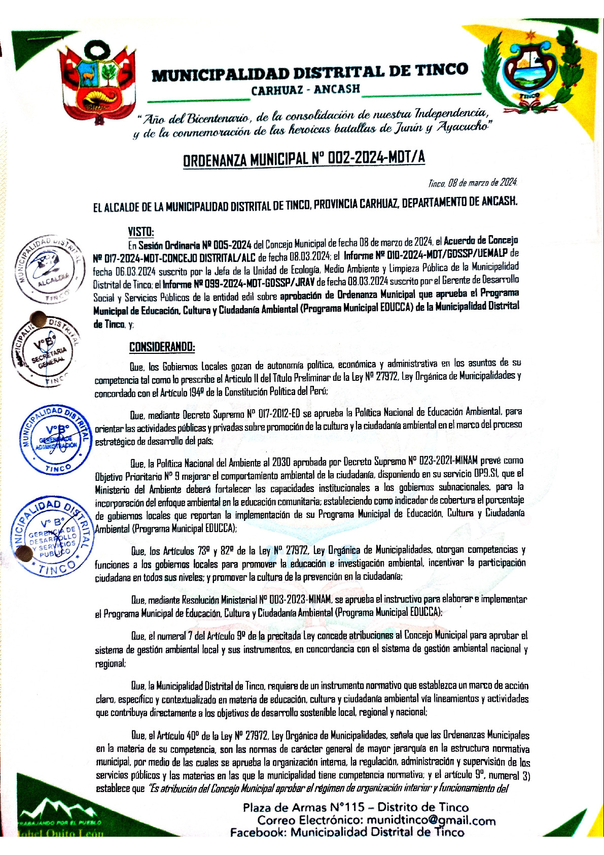 La presente Ordenanza aprueba el Programa Municipal de Educación, Cultura y Ciudadanía Ambiental de la Municipalidad Distrital de Tinco - Carhuaz (Ancash), con la finalidad de promover la cultura y la educación ambiental para la formación de ciudadanas y ciudadanos ambientalmente responsables e incentivar la participación ciudadana en todos sus niveles.