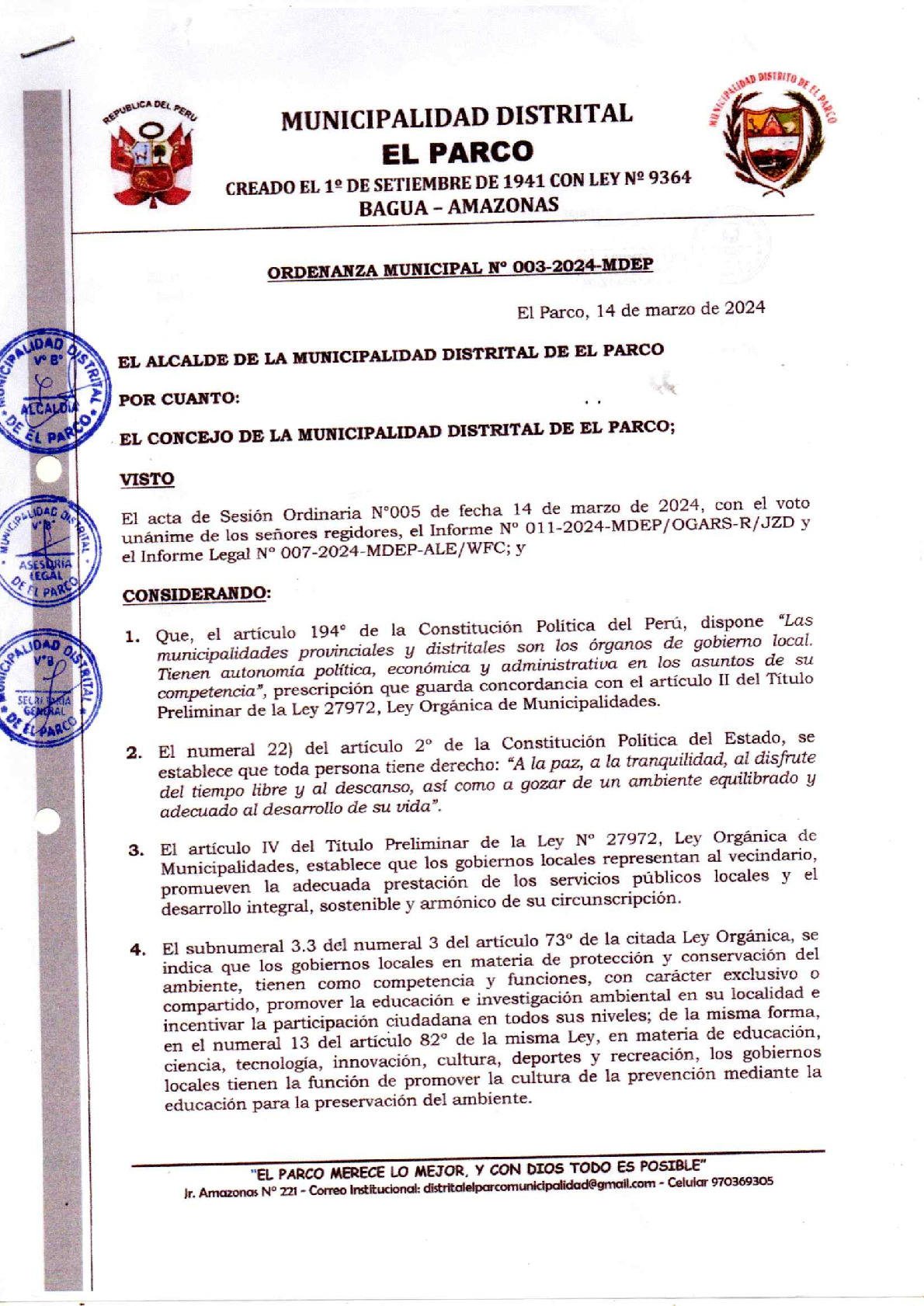 La presente Ordenanza aprueba el Programa Municipal de Educación, Cultura y Ciudadanía Ambiental de la Municipalidad Distrital de El Parco - Bagua (Amazonas), con la finalidad de promover la cultura y la educación ambiental para la formación de ciudadanas y ciudadanos ambientalmente responsables e incentivar la participación ciudadana en todos sus niveles.
