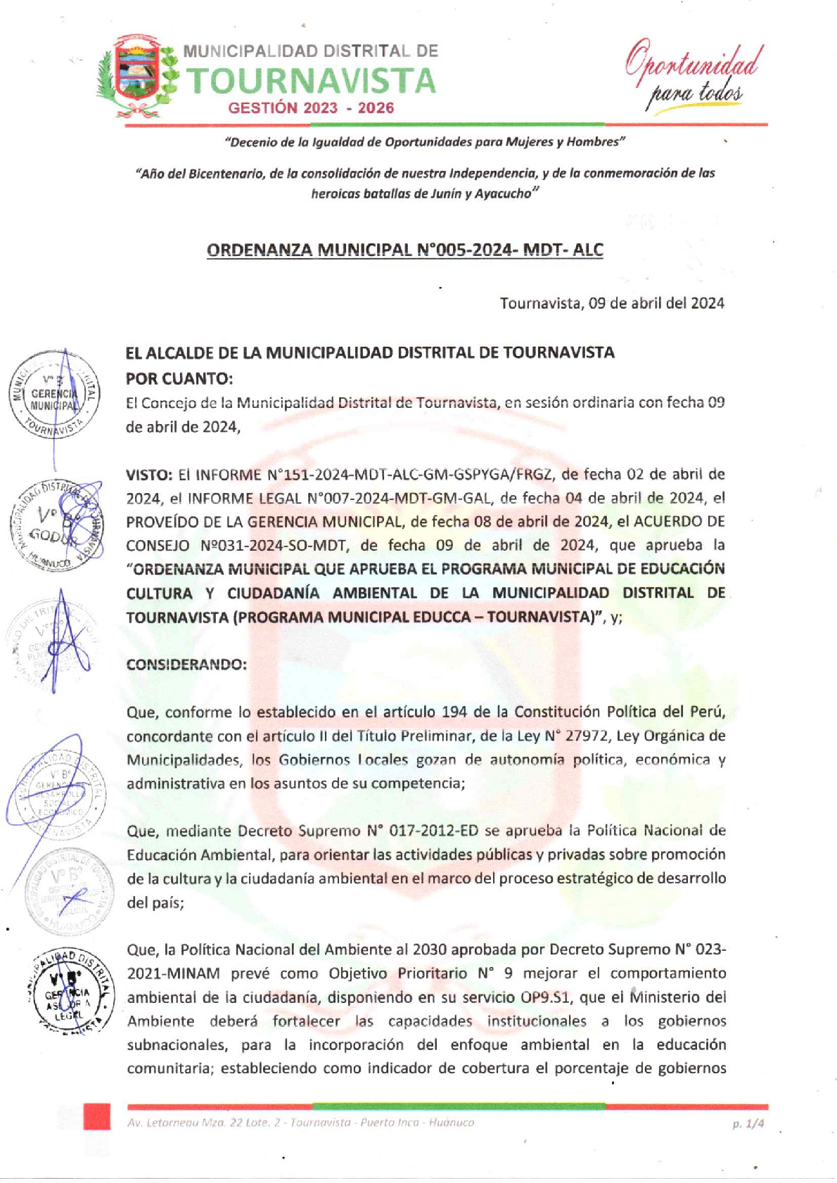 La presente Ordenanza aprueba el Programa Municipal de Educación, Cultura y Ciudadanía Ambiental de la Municipalidad Distrital de Tournavista - Puerto Inca (Huánuco), con la finalidad de promover la cultura y la educación ambiental para la formación de ciudadanas y ciudadanos ambientalmente responsables e incentivar la participación ciudadana en todos sus niveles.