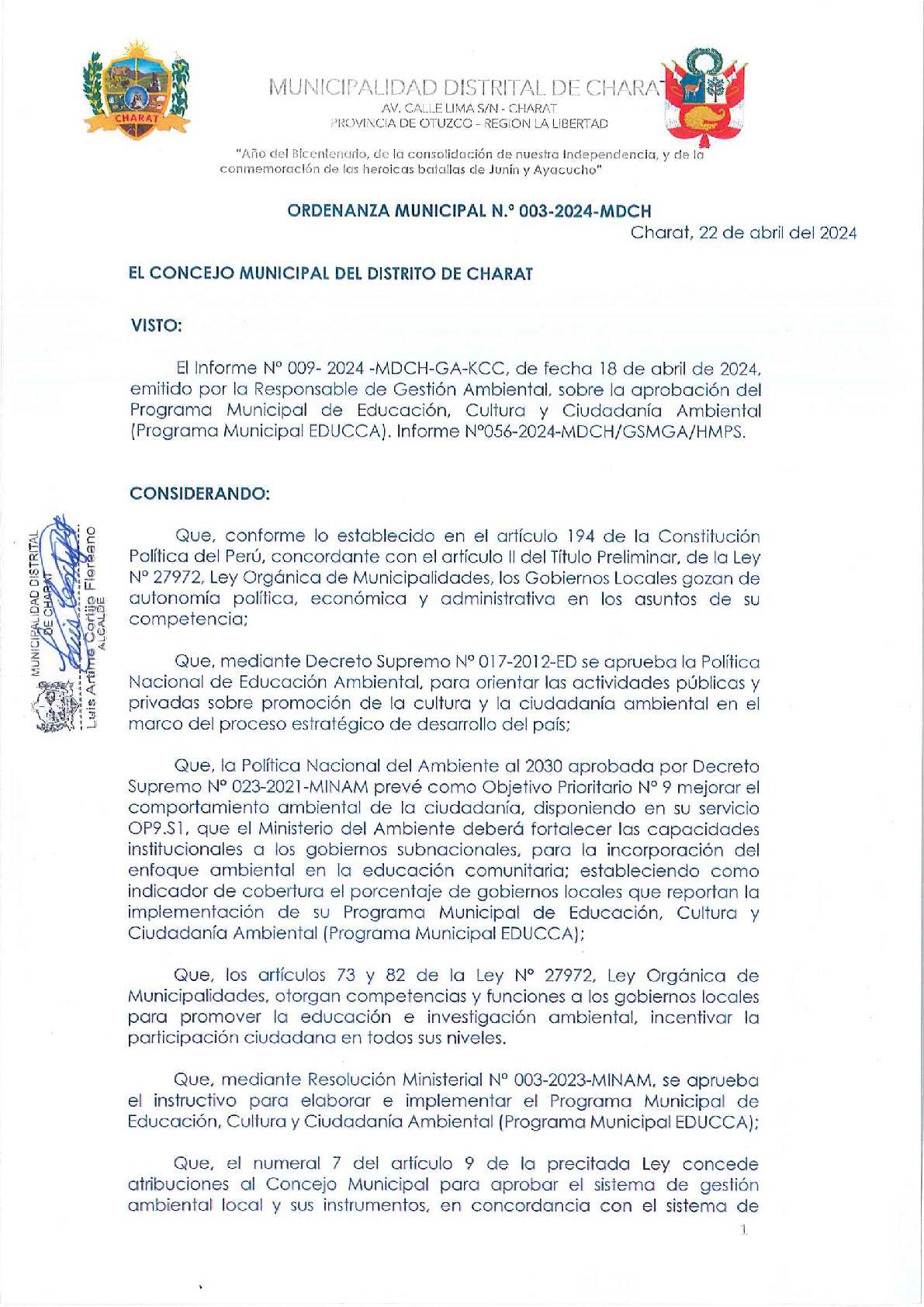La presente Ordenanza aprueba el Programa Municipal de Educación, Cultura y Ciudadanía Ambiental de la Municipalidad Distrital de Charat - Otuzco (La Libertad), con la finalidad de promover la cultura y la educación ambiental para la formación de ciudadanas y ciudadanos ambientalmente responsables e incentivar la participación ciudadana en todos sus niveles.