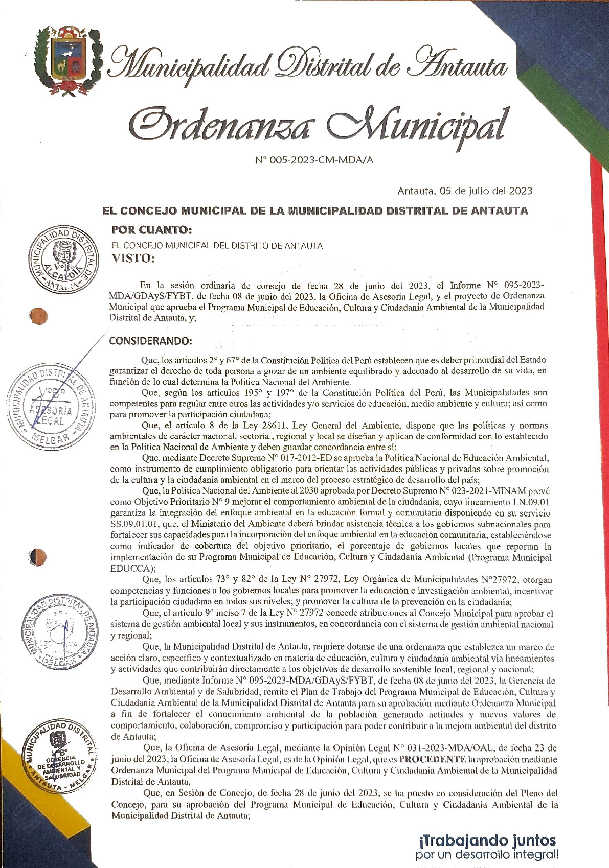 La presente Ordenanza aprueba el Programa Municipal de Educación, Cultura y Ciudadanía Ambiental de la Municipalidad Distrital de Antauta - Melgar (Puno), con la finalidad de promover la cultura y la educación ambiental para la formación de ciudadanas y ciudadanos ambientalmente responsables e incentivar la participación ciudadana en todos sus niveles.