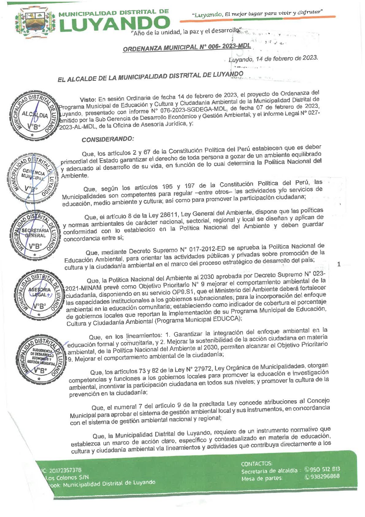 La presente Ordenanza aprueba el Programa Municipal de Educación, Cultura y Ciudadanía Ambiental de la Municipalidad Distrital de Luyando - Leoncio Prado (Huánuco), con la finalidad de promover la cultura y la educación ambiental para la formación de ciudadanas y ciudadanos ambientalmente responsables e incentivar la participación ciudadana en todos sus niveles.