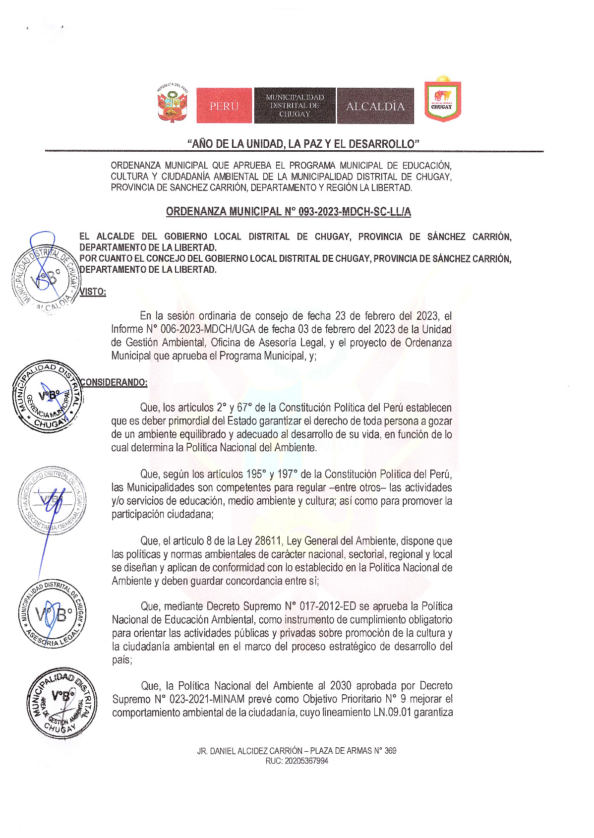 La presente Ordenanza aprueba el Programa Municipal de Educación, Cultura y Ciudadanía Ambiental de la Municipalidad Distrital de Chugay - Sánchez Carrión (La Libertad), con la finalidad de promover la cultura y la educación ambiental para la formación de ciudadanas y ciudadanos ambientalmente responsables e incentivar la participación ciudadana en todos sus niveles.