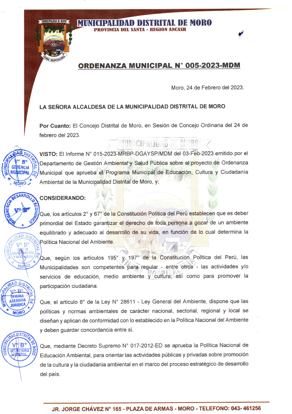 La presente Ordenanza aprueba el Programa Municipal de Educación, Cultura y Ciudadanía Ambiental de la Municipalidad Distrital de Moro - Santa (Áncash), con la finalidad de promover la cultura y la educación ambiental para la formación de ciudadanas y ciudadanos ambientalmente responsables e incentivar la participación ciudadana en todos sus niveles.