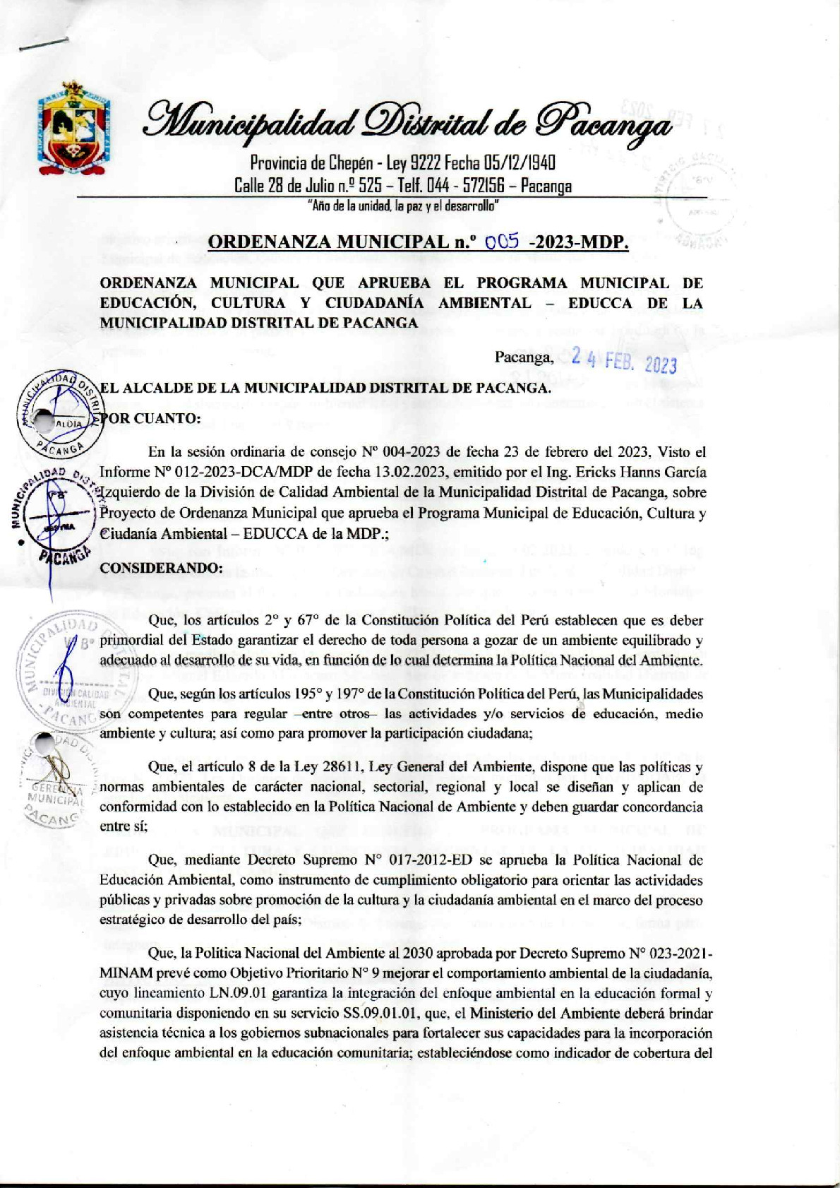 La presente Ordenanza aprueba el Programa Municipal de Educación, Cultura y Ciudadanía Ambiental de la Municipalidad Distrital de Pacanga - Chepén (La Libertad), con la finalidad de promover la cultura y la educación ambiental para la formación de ciudadanas y ciudadanos ambientalmente responsables e incentivar la participación ciudadana en todos sus niveles.