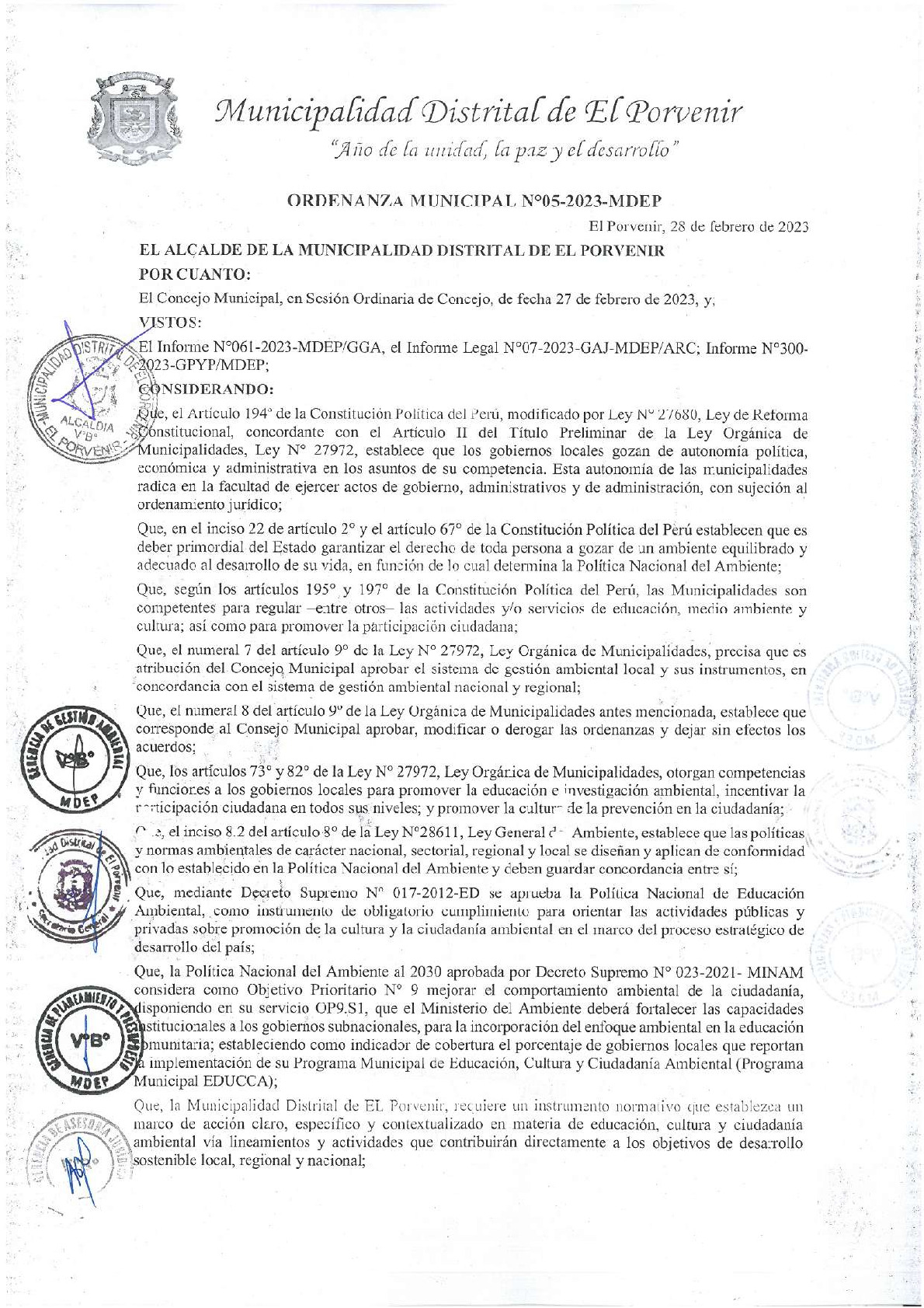 La presente Ordenanza aprueba el Programa Municipal de Educación, Cultura y Ciudadanía Ambiental de la Municipalidad Distrital de El Porvenir - Trujillo (La Libertad), con la finalidad de promover la cultura y la educación ambiental para la formación de ciudadanas y ciudadanos ambientalmente responsables e incentivar la participación ciudadana en todos sus niveles.