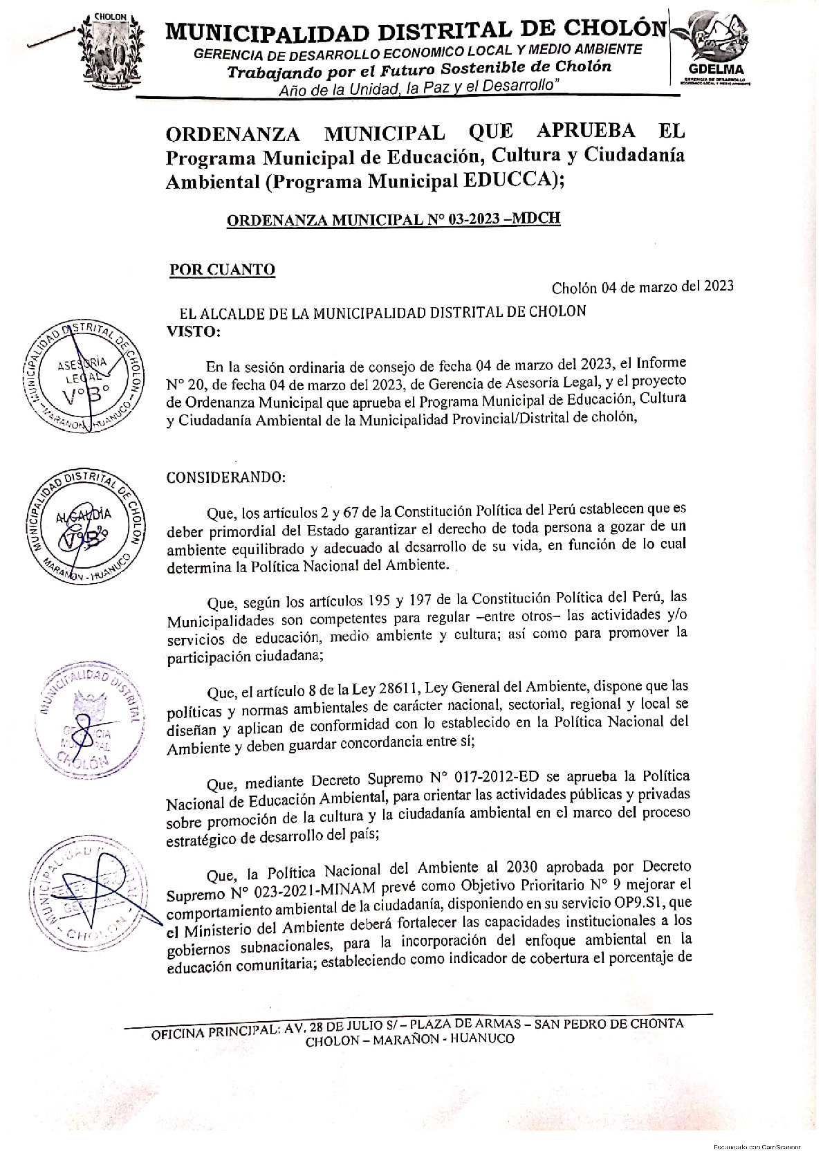 La presente Ordenanza aprueba el Programa Municipal de Educación, Cultura y Ciudadanía Ambiental de la Municipalidad Distrital de Cholón - Marañon (Huánuco), con la finalidad de promover la cultura y la educación ambiental para la formación de ciudadanas y ciudadanos ambientalmente responsables e incentivar la participación ciudadana en todos sus niveles.