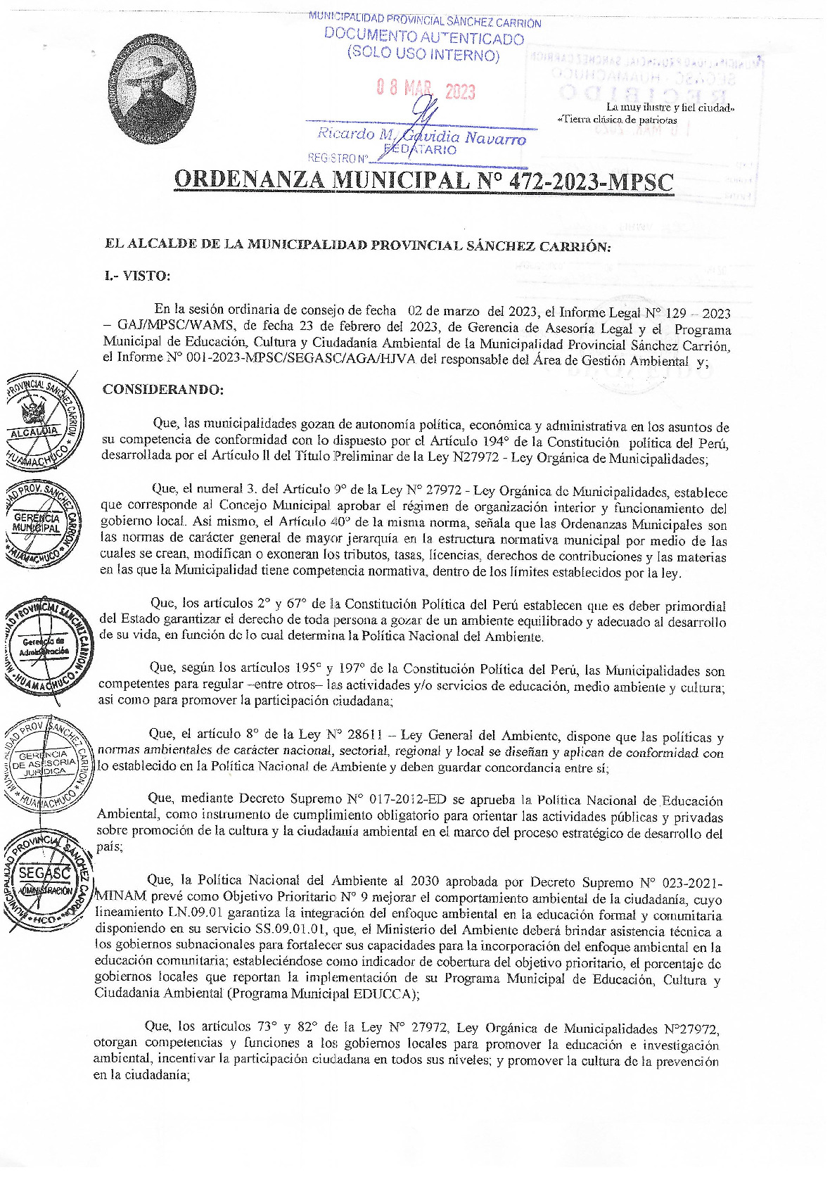 La presente Ordenanza aprueba el Programa Municipal de Educación, Cultura y Ciudadanía Ambiental de la Municipalidad Provincial de Sánchez Carrión - (La Libertad), con la finalidad de promover la cultura y la educación ambiental para la formación de ciudadanas y ciudadanos ambientalmente responsables e incentivar la participación ciudadana en todos sus niveles.