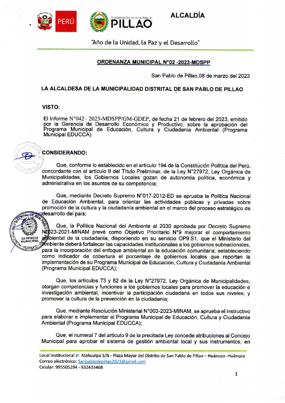 La presente Ordenanza aprueba el Programa Municipal de Educación, Cultura y Ciudadanía Ambiental de la Municipalidad Distrital de San Pablo de Pillao - Huánuco (Huánuco), con la finalidad de promover la cultura y la educación ambiental para la formación de ciudadanas y ciudadanos ambientalmente responsables e incentivar la participación ciudadana en todos sus niveles.