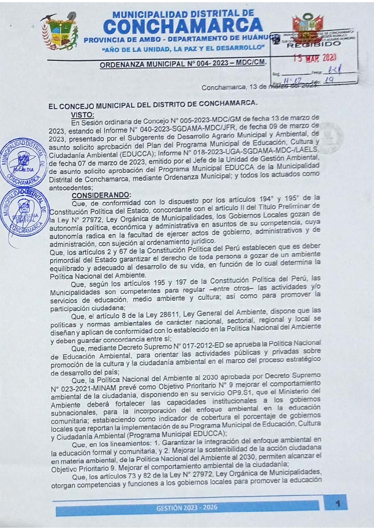 La presente Ordenanza aprueba el Programa Municipal de Educación, Cultura y Ciudadanía Ambiental de la Municipalidad Distrital de Conchamarca - Ambo (Huánuco), con la finalidad de promover la cultura y la educación ambiental para la formación de ciudadanas y ciudadanos ambientalmente responsables e incentivar la participación ciudadana en todos sus niveles.