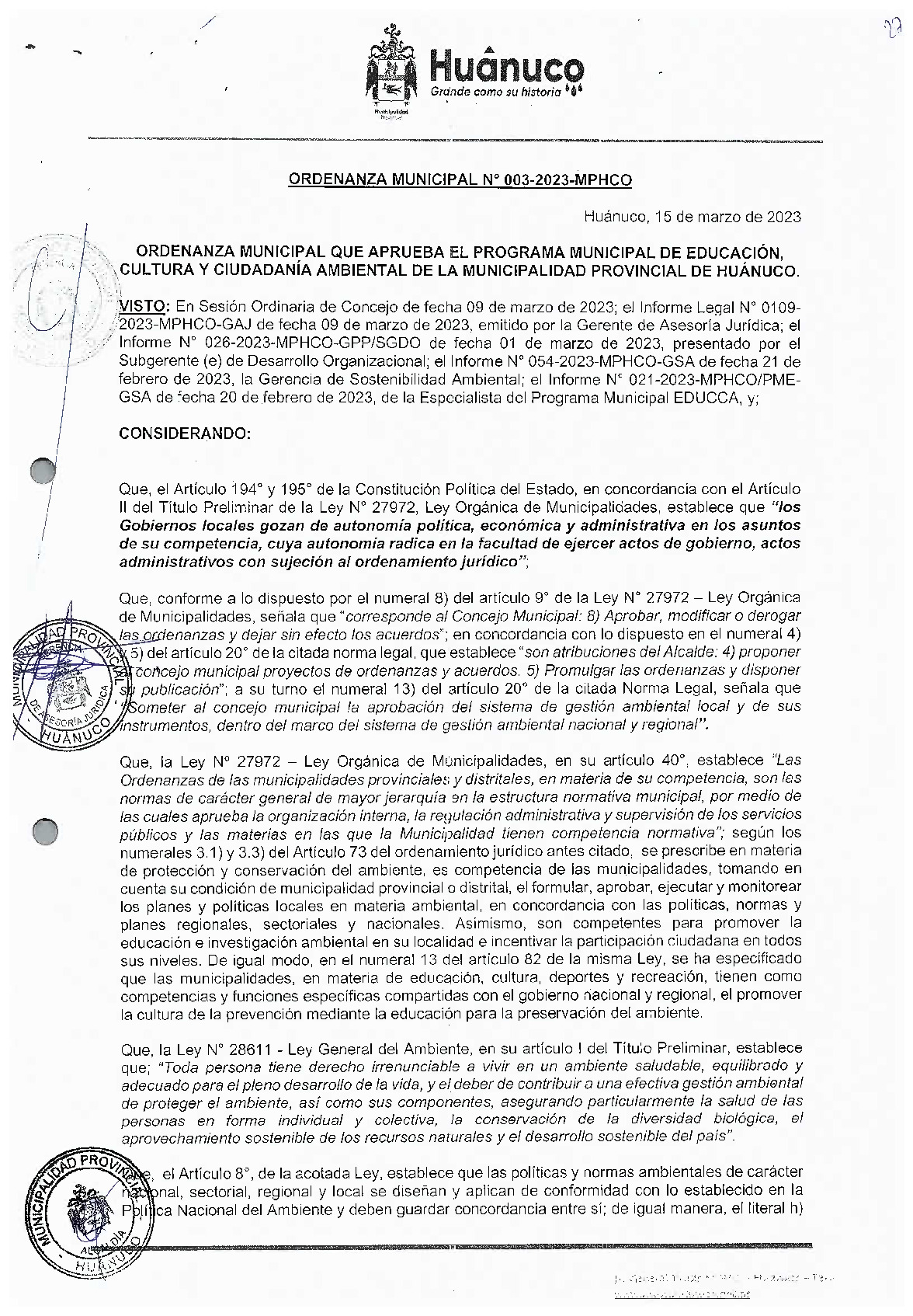 La presente Ordenanza aprueba el Programa Municipal de Educación, Cultura y Ciudadanía Ambiental de la Municipalidad Provincial de Huánuco - (Huánuco), con la finalidad de promover la cultura y la educación ambiental para la formación de ciudadanas y ciudadanos ambientalmente responsables e incentivar la participación ciudadana en todos sus niveles.