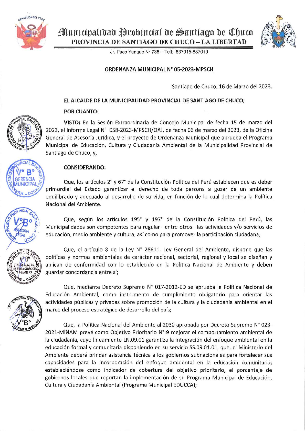 La presente Ordenanza aprueba el Programa Municipal de Educación, Cultura y Ciudadanía Ambiental de la Municipalidad Provincial de Santiago de Chuco - (Santiago de Chuco), con la finalidad de promover la cultura y la educación ambiental para la formación de ciudadanas y ciudadanos ambientalmente responsables e incentivar la participación ciudadana en todos sus niveles.