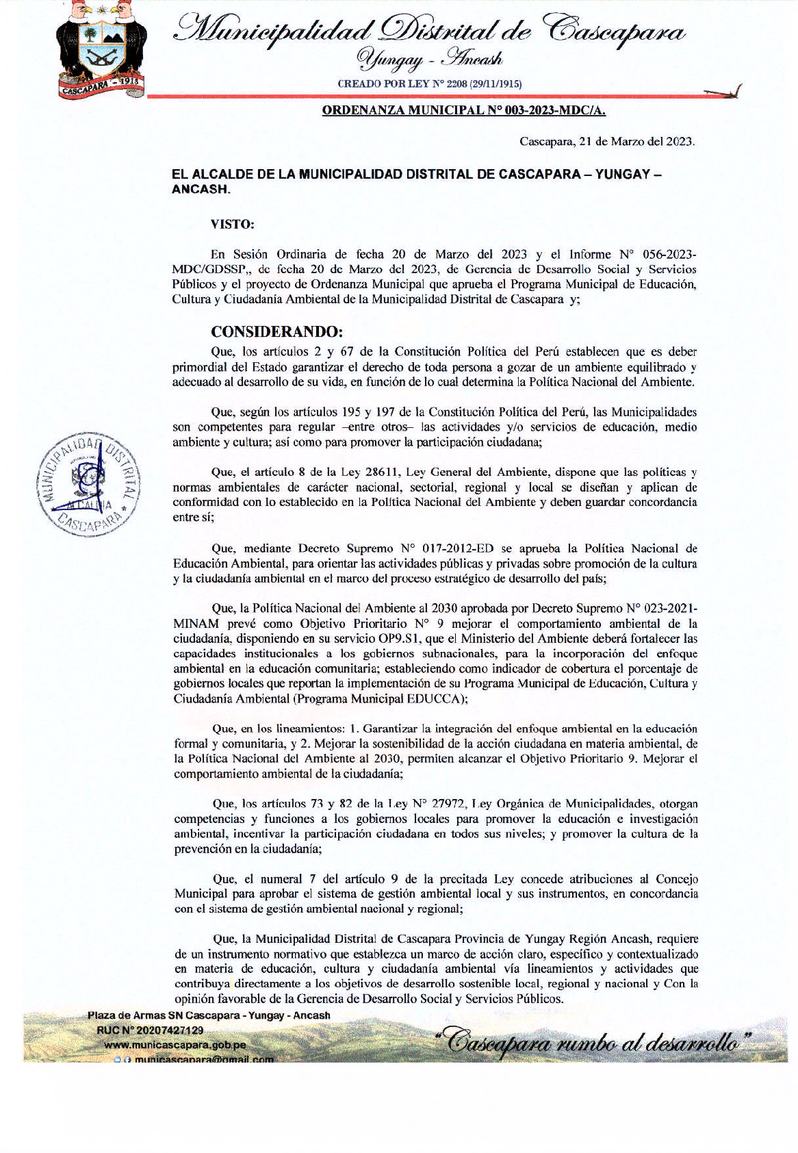 La presente Ordenanza aprueba el Programa Municipal de Educación, Cultura y Ciudadanía Ambiental de la Municipalidad Distrital de Cascapara - Yungay (Áncash), con la finalidad de promover la cultura y la educación ambiental para la formación de ciudadanas y ciudadanos ambientalmente responsables e incentivar la participación ciudadana en todos sus niveles.