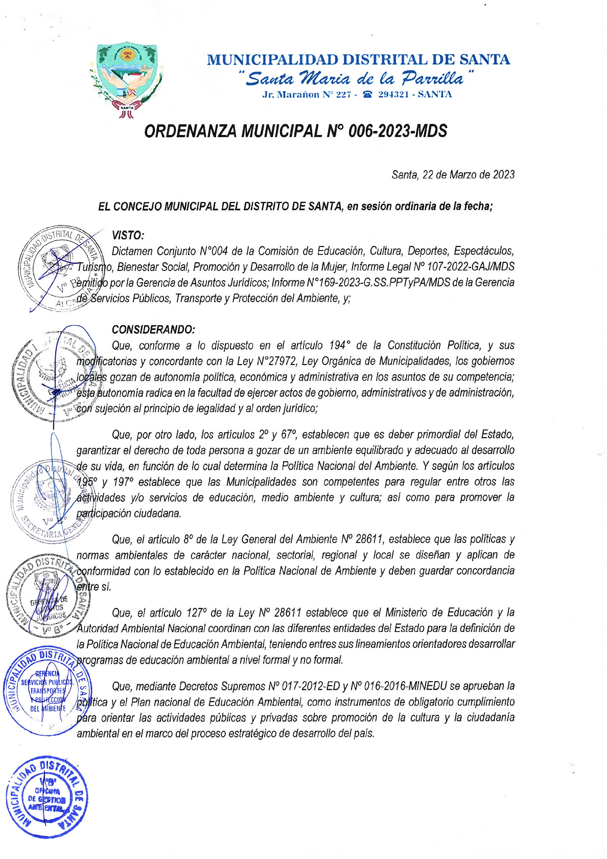 La presente Ordenanza aprueba el Programa Municipal de Educación, Cultura y Ciudadanía Ambiental de la Municipalidad Distrital de Santa - Santa (Áncash), con la finalidad de promover la cultura y la educación ambiental para la formación de ciudadanas y ciudadanos ambientalmente responsables e incentivar la participación ciudadana en todos sus niveles.