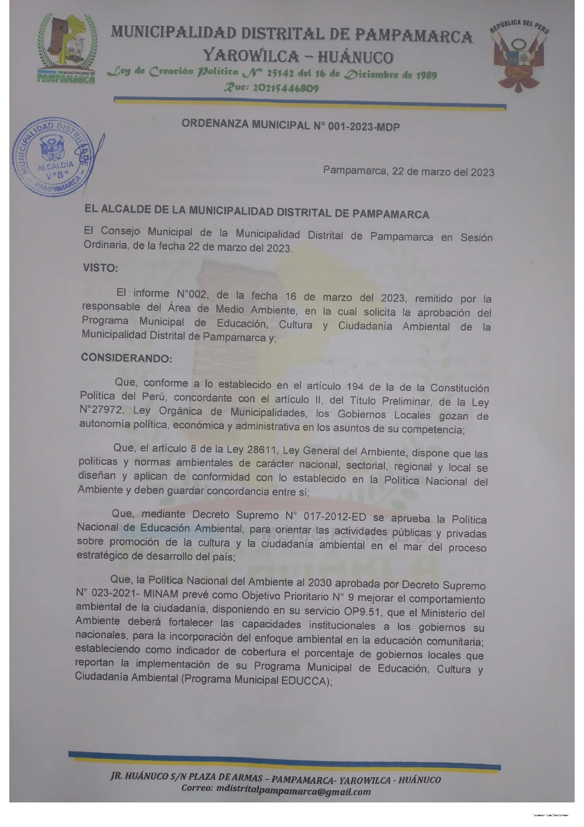 La presente Ordenanza aprueba el Programa Municipal de Educación, Cultura y Ciudadanía Ambiental de la Municipalidad Distrital de Pampamarca - Yarowilca (Huánuco), con la finalidad de promover la cultura y la educación ambiental para la formación de ciudadanas y ciudadanos ambientalmente responsables e incentivar la participación ciudadana en todos sus niveles.