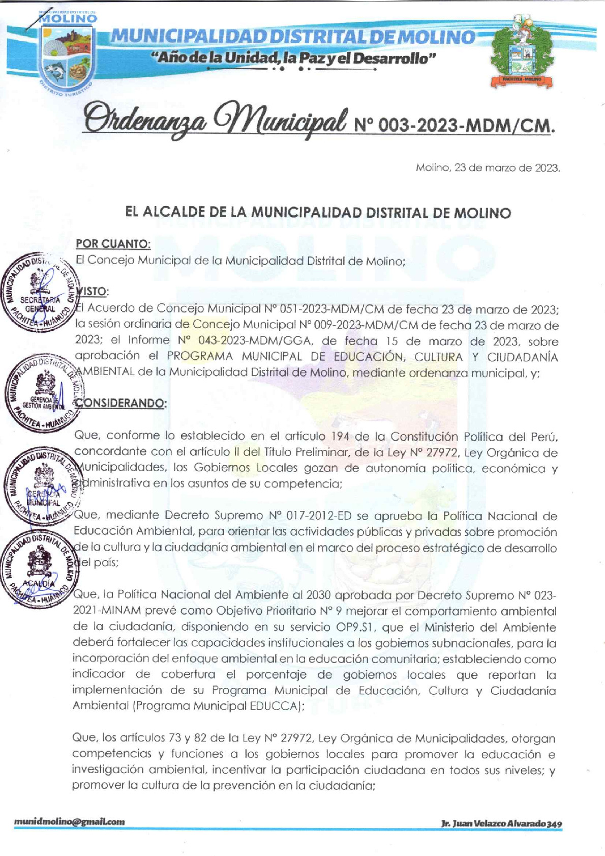 La presente Ordenanza aprueba el Programa Municipal de Educación, Cultura y Ciudadanía Ambiental de la Municipalidad Distrital de Molino - Pachitea (Huánuco), con la finalidad de promover la cultura y la educación ambiental para la formación de ciudadanas y ciudadanos ambientalmente responsables e incentivar la participación ciudadana en todos sus niveles.