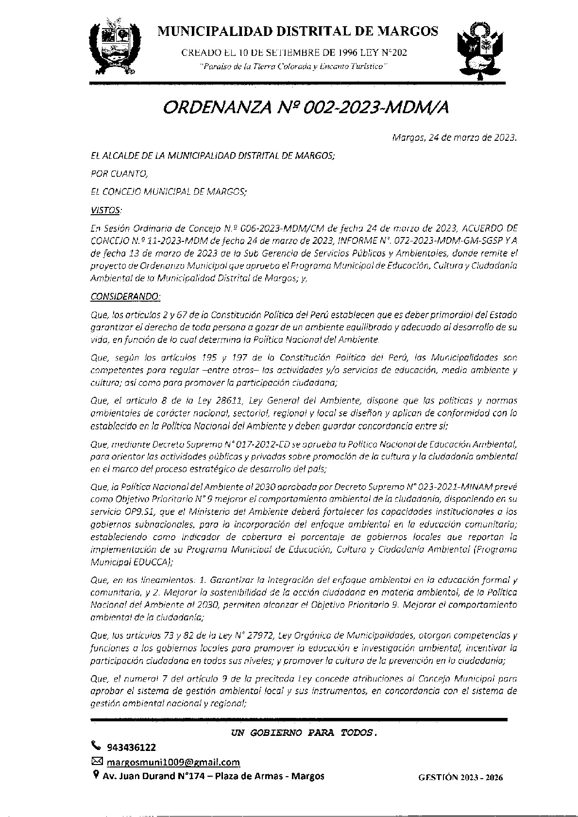 La presente Ordenanza aprueba el Programa Municipal de Educación, Cultura y Ciudadanía Ambiental de la Municipalidad Distrital de Margos - Huánuco (Huánuco), con la finalidad de promover la cultura y la educación ambiental para la formación de ciudadanas y ciudadanos ambientalmente responsables e incentivar la participación ciudadana en todos sus niveles.