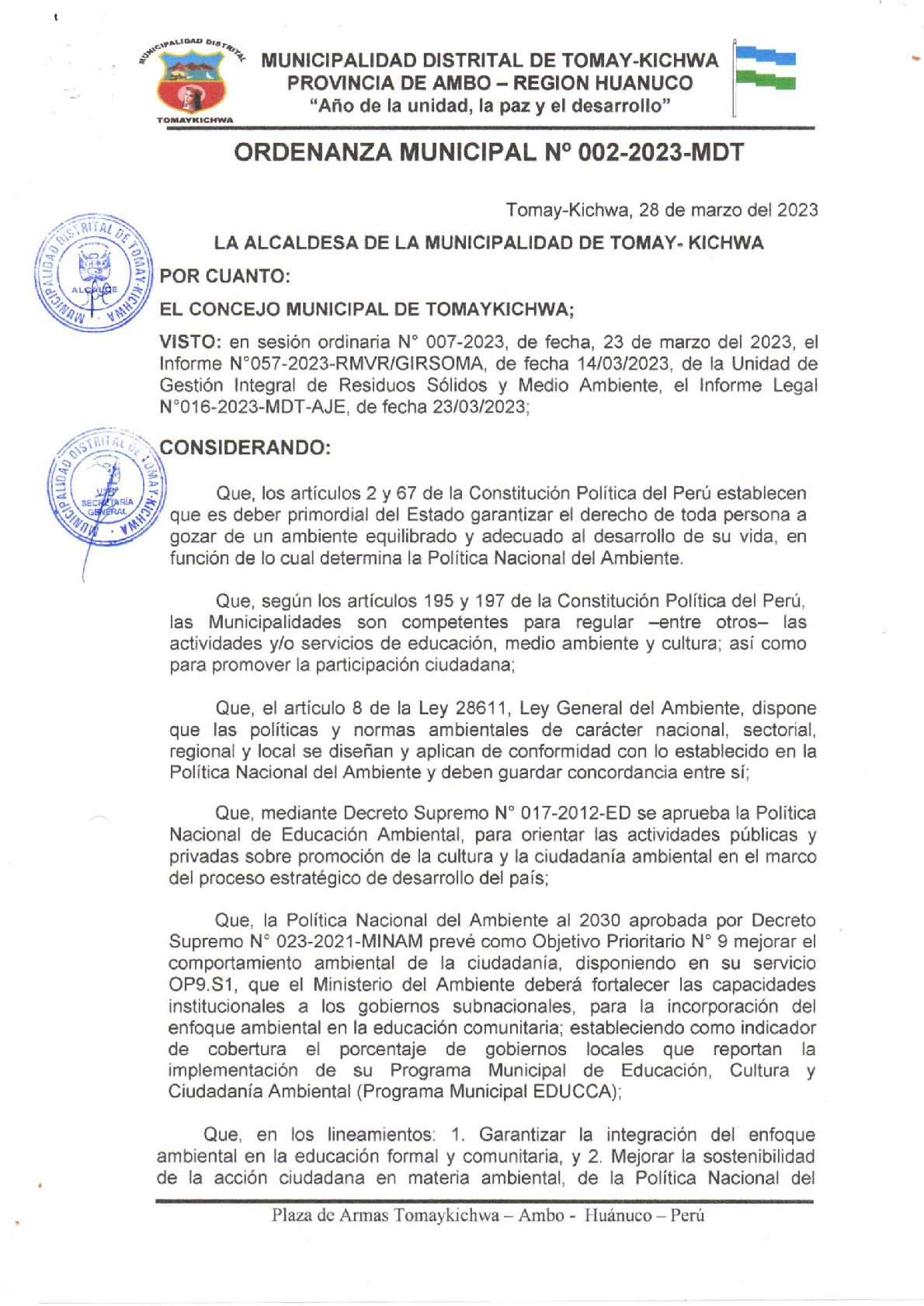 La presente Ordenanza aprueba el Programa Municipal de Educación, Cultura y Ciudadanía Ambiental de la Municipalidad Distrital de Tomay Kichwa - Ambo (Huánuco), con la finalidad de promover la cultura y la educación ambiental para la formación de ciudadanas y ciudadanos ambientalmente responsables e incentivar la participación ciudadana en todos sus niveles.